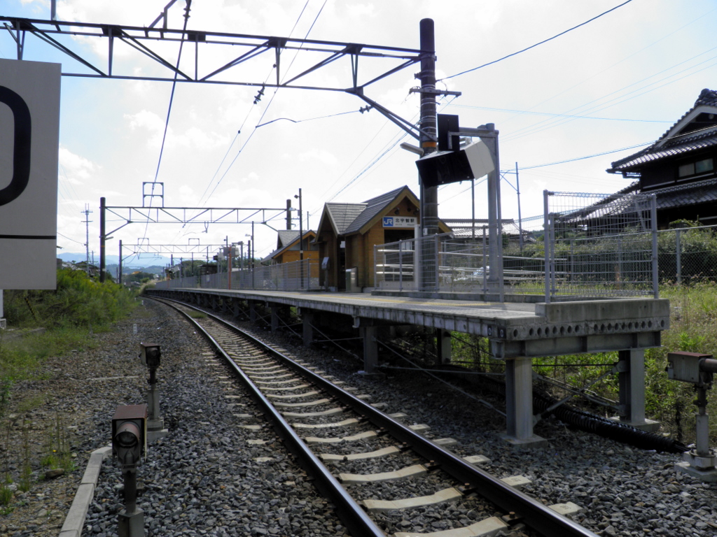과거에는 상대식 승강장 2면 2선을 갖추고 있어 열차 교행이 가능했다. 역사가 있는 쪽이 1번선(고조 방면), 맞은편이 2번선(오지 방면)이었다. 고조 방면에서 온 열차가 이 역에 정차하려면 먼저 인상선으로 들어갔다가 후진하여 역 승강장으로 진입했으며, 오지 방면에서 온 열차는 반대의 순서로 운행했다. 열차가 이 역을 통과할 경우에는 스위치백 없이 역 구내 및 인상선에 들어가지 않고 본선을 그대로 통과할 수 있었다[5]. 스위치백을 위한 입환 작업 중에는 약 4분 동안 건널목 차단기가 내려져 있었기 때문에, 역 북쪽 건널목에는 이러한 내용을 알리는 안내판이 설치되어 있었다.