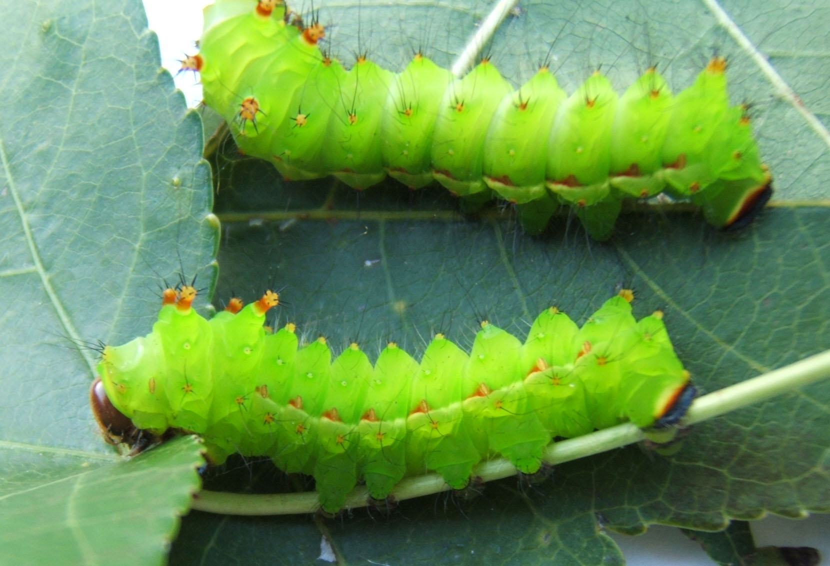 긴꼬리산누에나방의 유충은 성장하면서 여러 령(instar) 단계를 거친다. 유충의 각 령별 사진은 다음과 같다.