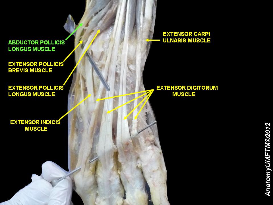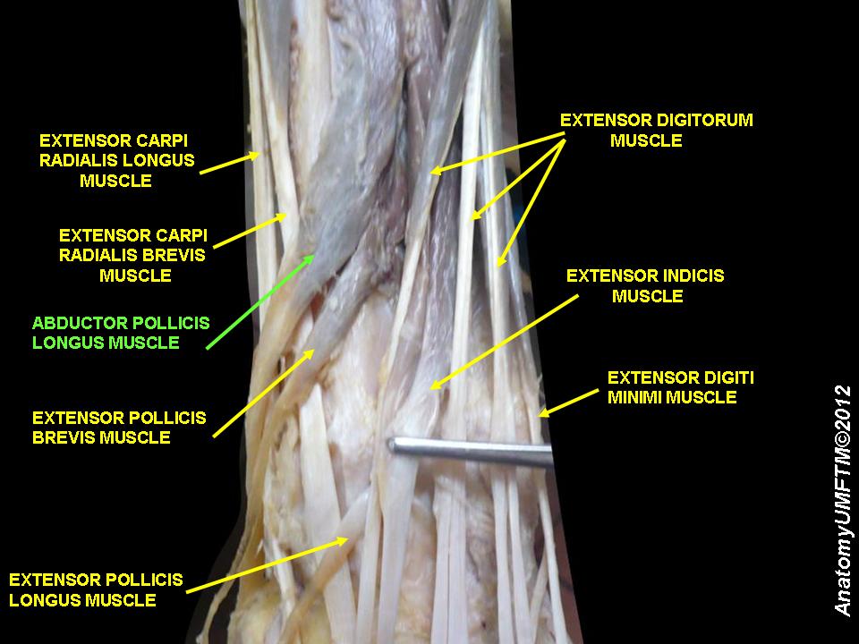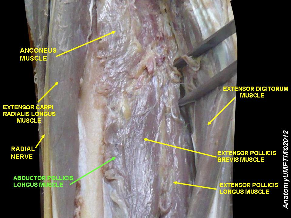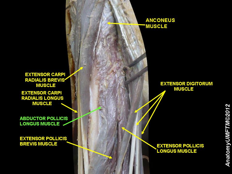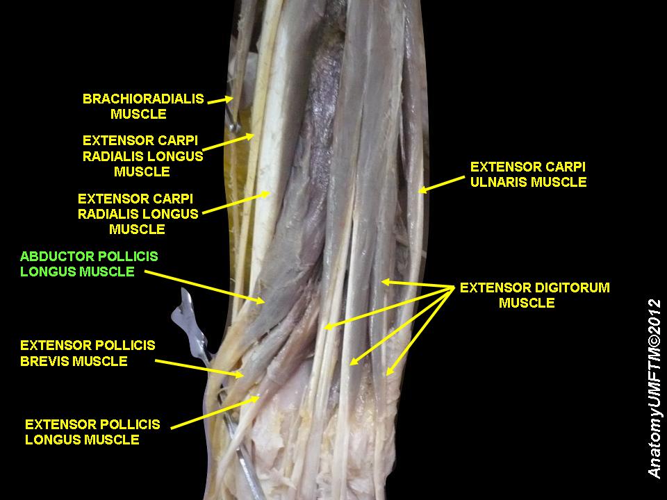 아래가쪽으로 비스듬하게 주행한 긴엄지벌림근은 힘줄이 되어 끝난다. 이 힘줄은 노뼈 아래쪽 끝의 가쪽 측면에 있는 고랑을 통해 주행하며, 이때 짧은엄지폄근의 힘줄을 동반한다.[17][2]