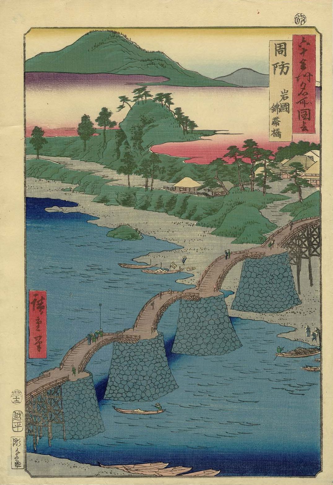 히로시게의 1856년 목판화. 육십여 개 국의 유명한 풍경 중 긴타이교를 그림