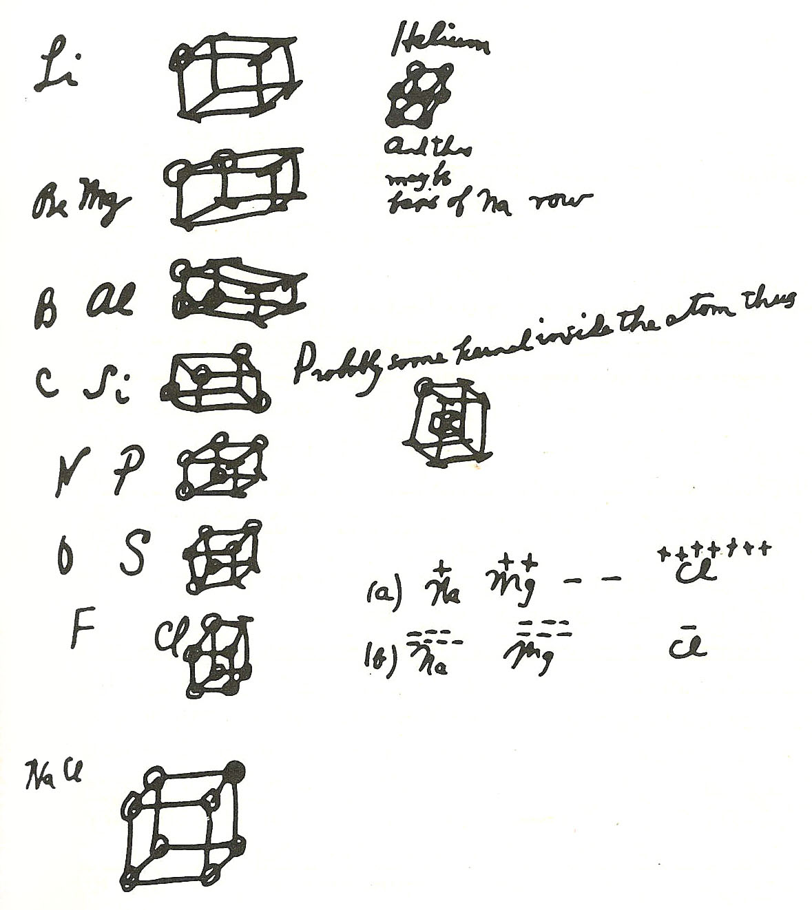 1902년경부터 루이스는 강의 노트에 입방체 원자 모형을 그리기 시작했는데, 이는 입방체의 각 꼭짓점이 전자의 위치를 나타내는 원자 모형이었다. 그는 이 개념을 1916년 발표한 화학 결합에 관한 고전적인 논문 "The Atom and the Molecule"[64]에서 처음으로 공식화했다. 이 논문에서 그는 원자 간 전자 쌍 공유 개념(공유 결합)을 제시하고, 불쌍전자를 가진 라디칼을 "odd molecule"로 정의했으며, 전자식 표기법도 포함했다. 이러한 화학 결합에 대한 그의 아이디어는 어빙 랭뮤어에 의해 더욱 발전되었고 라이너스 폴링의 연구에 영감을 주었다.