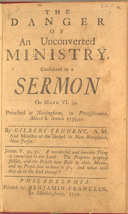 - [https://www.logcollegepress.com/s/Tennent-Gilbert-The-Danger-of-an-Unconverted-Ministry.pdf ''The Danger of an Unconverted Ministry, Considered in a sermon on Mark VI. 34. Preached at Nottingham, in Pennsylvania, March 8, Anno 1739,40''] (1740)