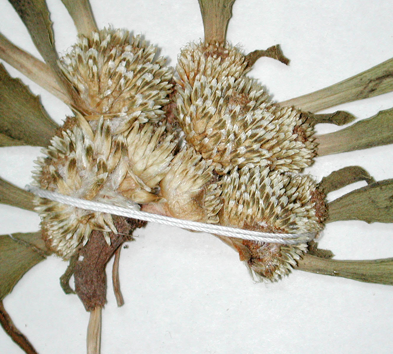 잎 로제트 중앙에 밀집된 공중 꽃차례는 다소 낮은 꽃양배추처럼 배열되어 있다. 소화(小花) 무리는 기능적으로 수컷이거나 기능적으로 암컷이다. 총포 조각은 여러 겹으로 겹쳐져 있고, 종이 같으며, 희끄무레하고, 뾰족한 끝을 가지고 있다.[7] 공중 꽃차례는 고슴도치와 다소 유사하며, 단단하고 건조한 식물은 발로 밟으면 맨발을 아프게 한다.[9]