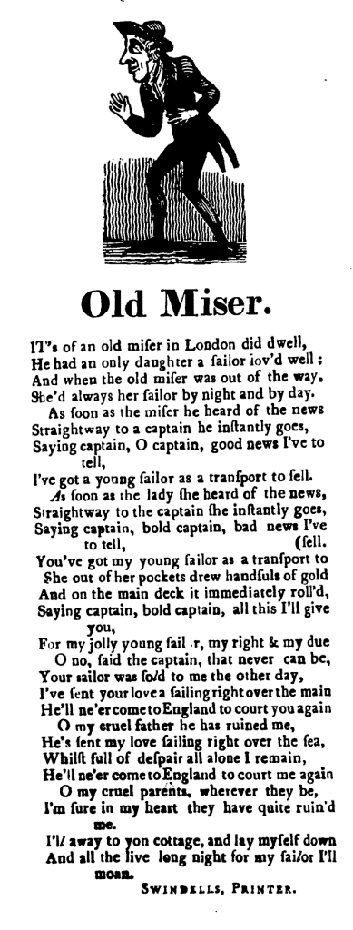 17세기부터 구두쇠에 관한 다양한 이야기를 다룬 브로드사이드 발라드가 대중적인 시의 영역에 존재했다. 초기에는 가난한 사람들에게 고통을 안겨준 곡물 투기꾼들을 다룬 내용이 많았다. 예를 들어 "불쌍한 구두쇠" (1682)는 곡물 한 짐을 시장에 가져온 욕심 많은 농부가 정직한 가격 대신 악마에게 주겠다고 맹세하고, 결국 악마가 농부까지 데려간다는 내용이다.[58] 각 연의 후렴구에는 "아, 농부들, 욕심 많은 농부들아,/ 왜 가난한 사람들을 쥐어짜는가?"라는 사회적 메시지가 담겨 있다.[58] 토마스 조던의 "욕심 많은 구두쇠를 위한 거울"에서는 웨스트 컨트리 사업가와 가난한 농부가 이윤 추구와 만족에 대해 논쟁하고, 구두쇠는 곡물 가격이 오를 때까지 팔지 않겠다고 결심한다.[59] 19세기 초까지 농부가 "부유한 구두쇠의 삶과 끔찍한 죽음"의 주제가 되는 발라드가 이어졌다.[60]구두쇠의 딸이 자신이 선택한 남자와 결혼하지 못하고 아버지를 속이는 계략을 다룬 발라드도 흔했다. "구두쇠를 속이다"에서는 한 선원이 악마로 분장하여 구두쇠와 목사를 겁주어 결혼을 허락하게 한다.[61] "정치적인 연인들 또는 윈저 구두쇠를 속이다"에서는 정육점이 악마로 변장하여 구두쇠를 겁주어 재산을 넘겨준다.[62] 1800년경에는 "늙은 구두쇠"라는 영어 브로드사이드 발라드가 민요로 발전했으며,[63] 런던을 배경으로 구두쇠의 딸이 선원에게 구애받고 아버지가 그를 강제 징집하여 제거하려 한다. 이 발라드는 영국뿐 아니라 미국과 트리스탄 데 쿤하에도 버전이 존재한다.[64] "물린 곳에 물린 곳 또는 시골 아가씨에게 속은 구두쇠" (1736–63)는 혼외 관계를 통해 아이를 낳은 소녀가 아이를 팔고, 부유한 구두쇠가 그 거래를 성사시켜 결국 아이를 부양하게 된다는 내용이다.[65]
