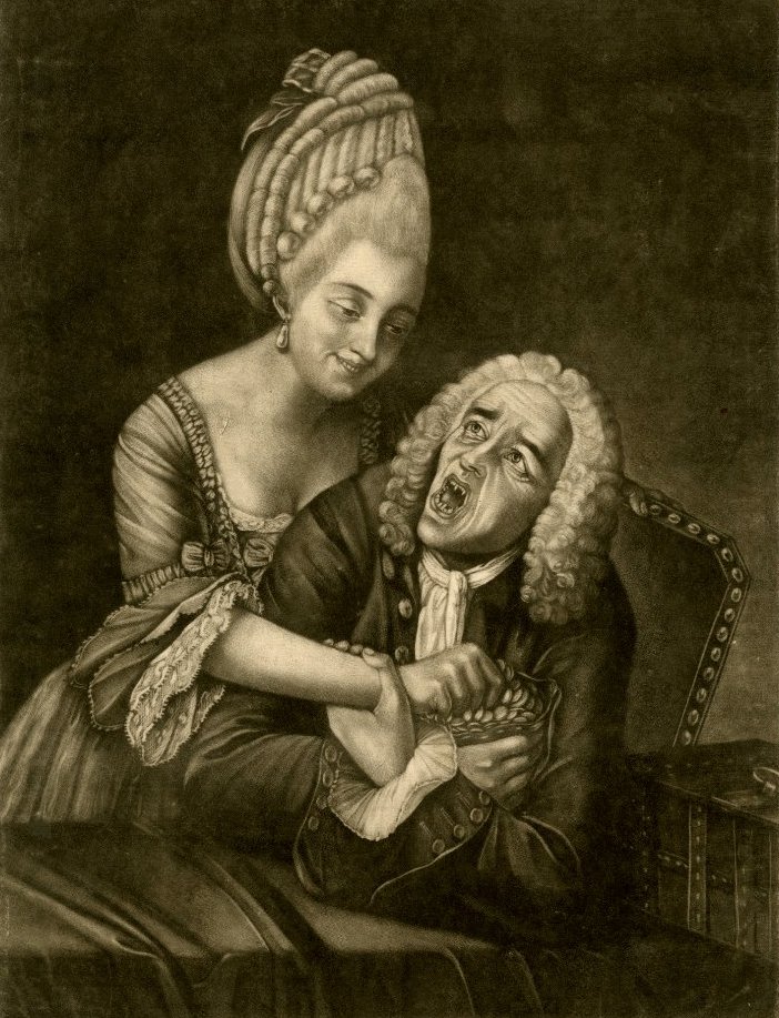 한스 홀바인 2세의 "구두쇠와 그의 정부"는 젊은 여성이 구두쇠의 돈을 훔치는 모습을 묘사한다. 필립 데이의 판화 ''약탈, 또는 젊은 아내에게 약탈당하는 늙은 그리푸스''는 구절 해설과 함께 이 상황을 보여준다.[159]