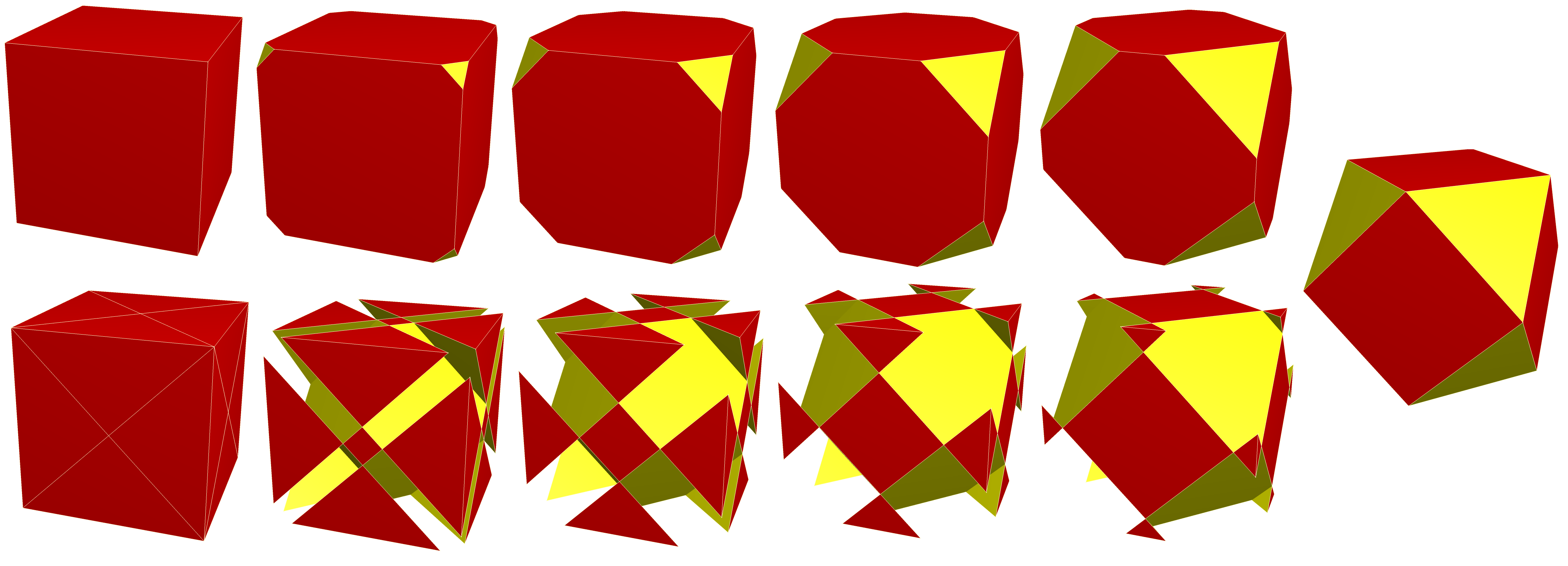 팔각별의 자기 교차 부분을 제거하고 정사각형을 남기며, 삼각형을 깎아 육각형으로 만들면 깎은 정팔면체가 생성되고, 이 과정은 중앙의 정사각형이 점으로 줄어들고 정팔면체가 생성되면서 끝난다.[1]