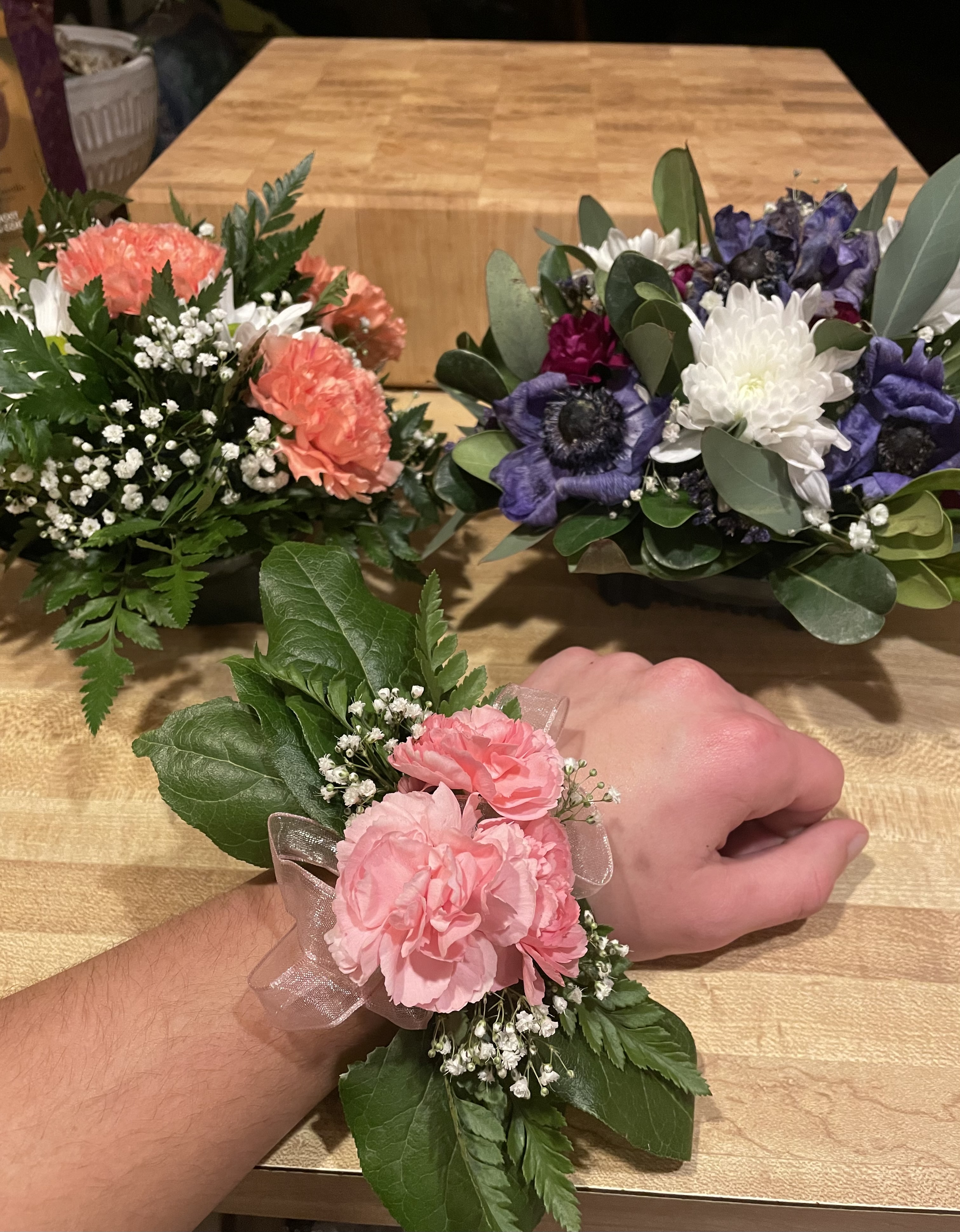 고등학교 꽃꽂이 디자인 학생이 제작한 꽃꽂이 모음. 이 사진은 두 개의 둥근 꽃꽂이와 코르사주를 보여준다.
