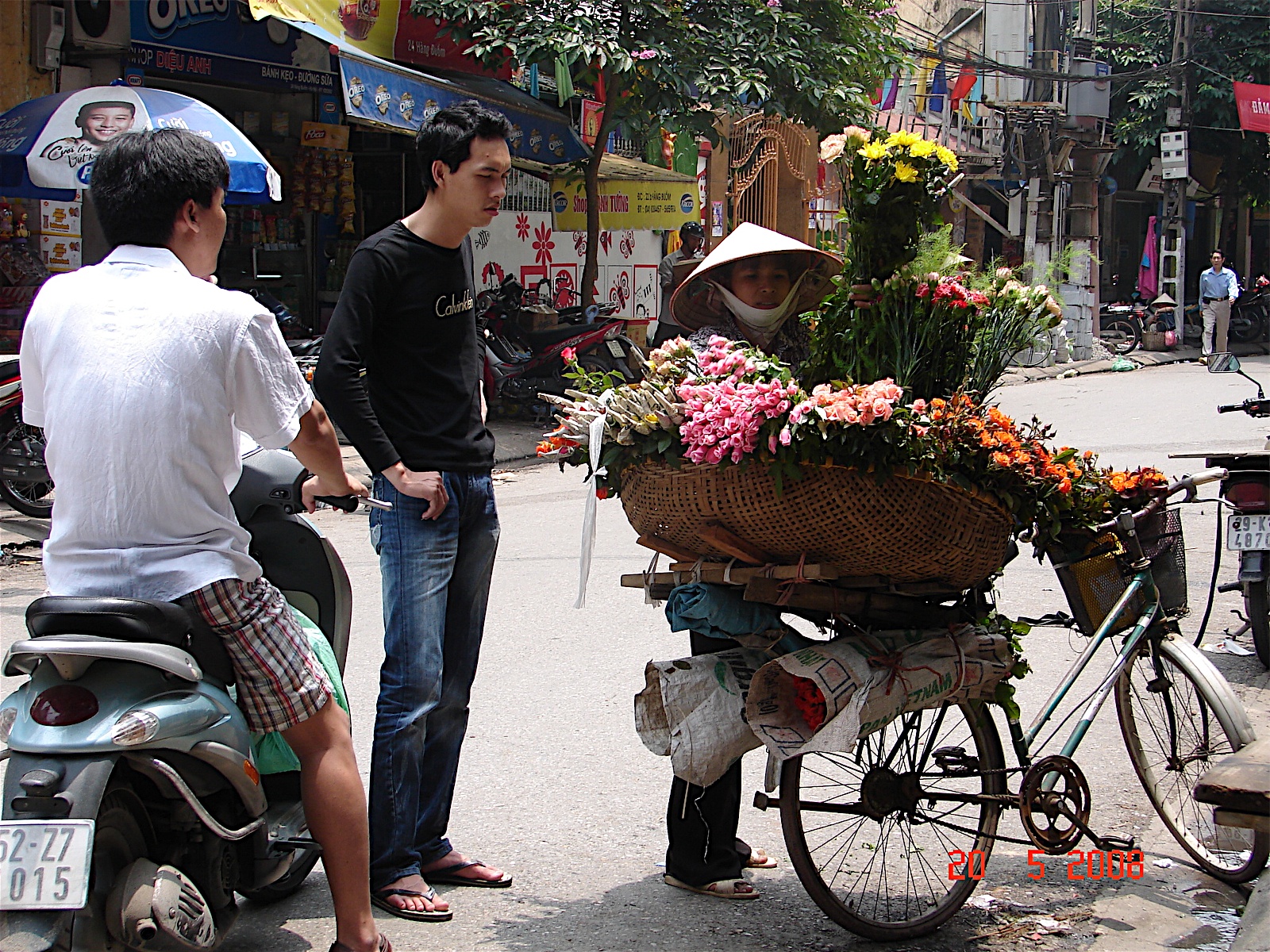 하노이, 베트남 거리에서 자전거에 꽃을 싣고 판매하는 노점상