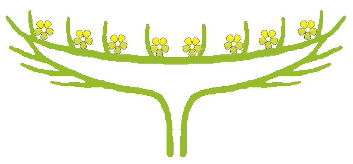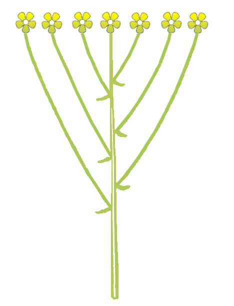 - 산방꽃차례: 꽃가지의 끝이 거의 같은 높이로 자라서 꽃이 가운데를 향해 피어난다. (유채, 냉이, 무, 벚나무)