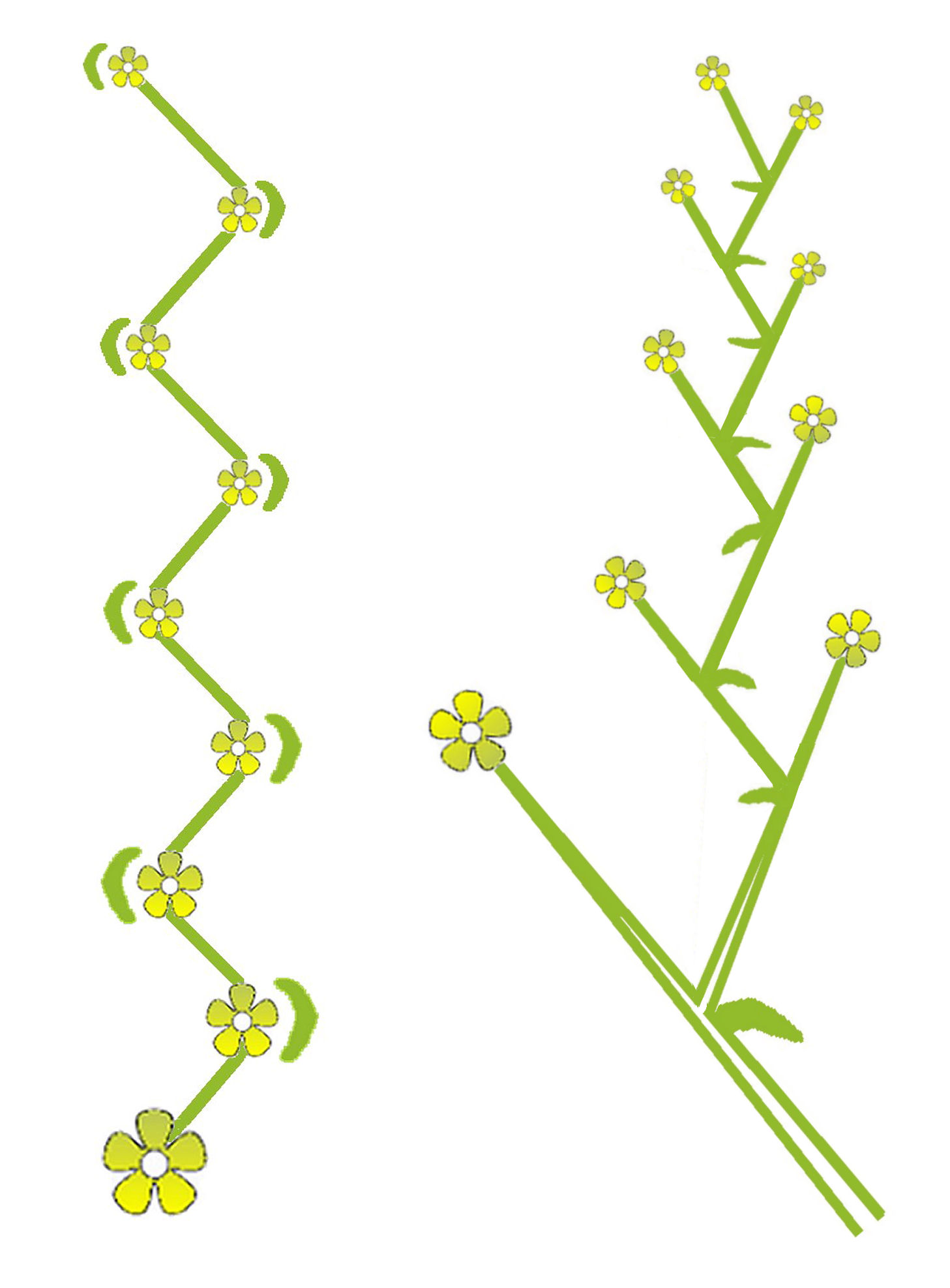 - 무한화서: 단생 성장. 정단아가 계속 자라며 측면 꽃을 형성하고, 정단화는 형성되지 않는다.