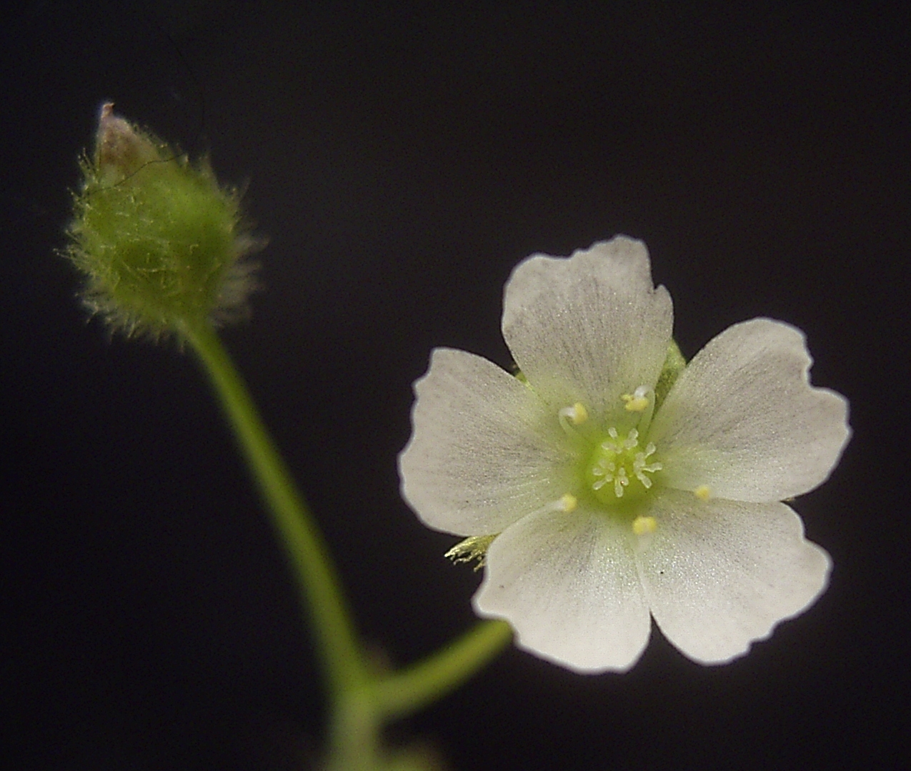 꽃은 5월에서 6월 사이에 피며, 줄기 윗부분이나 끝에 총상꽃차례로 2개에서 10개의 꽃이 달린다. 꽃줄기와 꽃차례를 합한 길이는 2cm에서 6cm 정도이다. 꽃 색깔은 다양하지만 주로 흰색 또는 옅은 분홍색이며, 화관의 지름은 약 1cm이다. 꽃받침은 달걀 모양(난형)이고 끝이 뭉툭하며, 가장자리가 잘게 갈라지고 그 끝은 선(腺) 조직으로 되어 있다. 꽃잎은 5장으로 넓은 거꿀달걀 모양이며 길이는 6mm~8mm이다. 수술은 5개이고, 암술대는 3개인데 각각 4갈래로 갈라져 있다. 꽃은 보통 오전 10시경에 피었다가 오후에는 닫힌다. 꽃이 필 무렵에는 뿌리에서 돋았던 잎(근생엽)이 마른다.[12]
