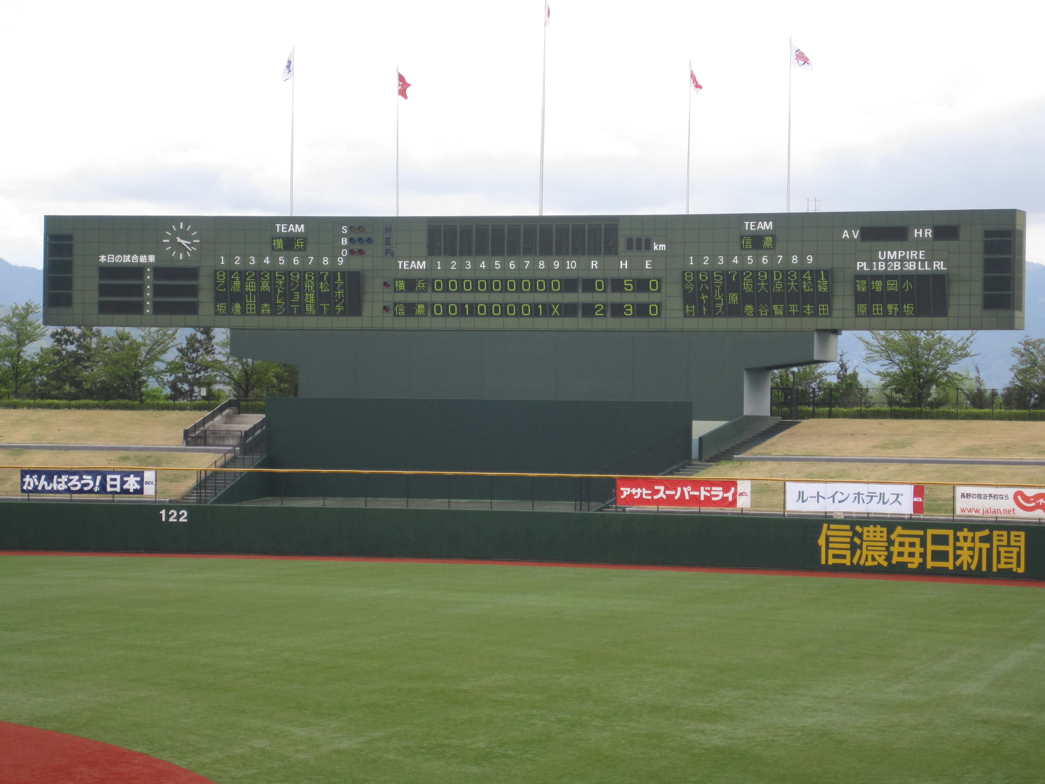 이 구장의 프로 공식전 대부분은 현내 전역에서 판매되는 지방지인 시나노 마이니치 신문이 주최 또는 공동 주최로 개최하고 있다. 나가노현 남부(마쓰모토시 등)는 주니치 신문의 판매 지역이지만, 나가노시 등의 호쿠신, 우에다시 등의 도신은 지역 외여서 현 전체에서는 판매되지 않기 때문에, 주니치 드래건스의 지방 주최 공식전은 이 구장에서 한 번도 개최된 적이 없다(타 구단 주최 경기의 대전 상대로서 개최된 적은 있다).