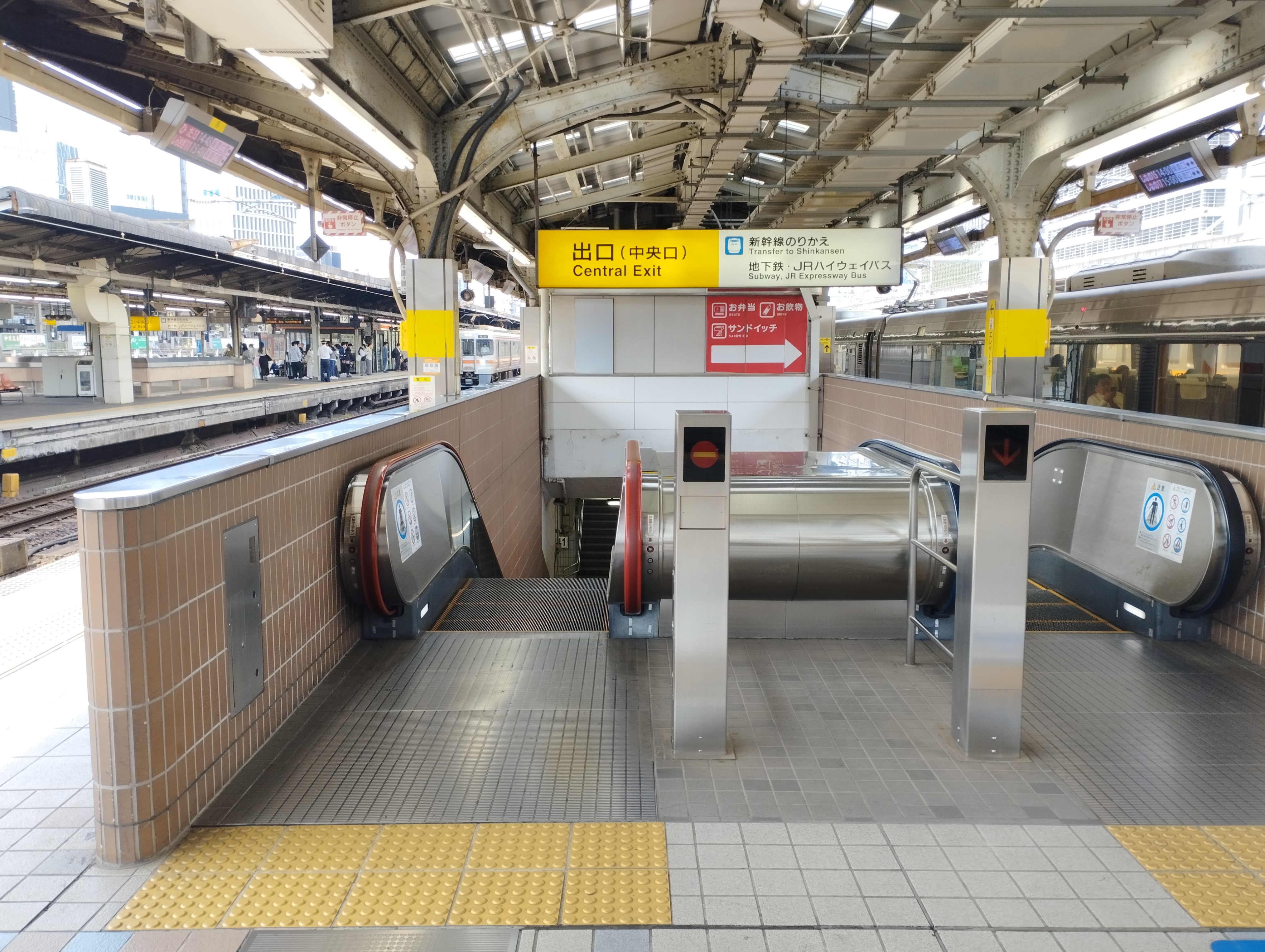 개찰구는 사쿠라도리 선 측과 히가시야마 선 측에 각각 3곳씩 있다. 지하철 역명 사인이 있는 출입구는 사쿠라도리 선 측에 3곳, 히가시야마 선 측에 10곳 있다. 사쿠라도리 선으로 가는 출입구는 JR 나고야역 콘코스에도 3곳(사쿠라도리구치 부근, 다이코도리구치 부근, 우마이몬도리 부근) 있다. 사쿠라도리 선과 히가시야마 선 간 환승은 연락 통로를 이용하여 가능하다. 연락 통로의 엘리베이터는 2020년 3월 24일에 사용이 개시되었다.