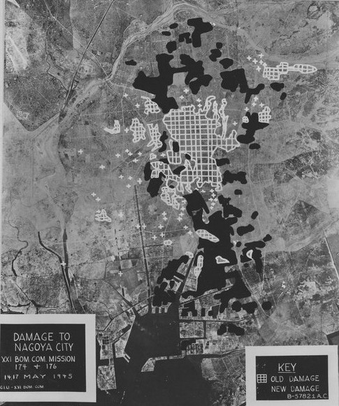미국 전략 폭격 조사에 따르면, 태평양 전쟁의 마지막 9개월 동안 나고야의 공장과 도시 지역에 정밀 및 광역 공습으로 14054ton의 폭탄이 투하되었다. 도쿄 외에 일본의 어떤 도시도 그렇게 많은 공격을 받지 않았다. 나고야는 1944년 12월 13일부터 1945년 7월 24일까지 21차례 공격을 받았다.[14]