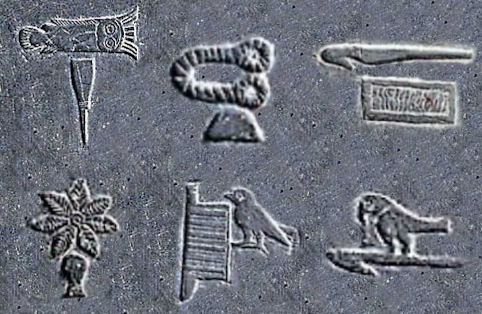 파라오 바로 앞에는 긴 머리카락을 한 남자가 있는데, 그의 이름으로 해석된 한 쌍의 상형 문자 ''Tshet''(이것은 이러한 기호가 후기 상형 문자에서 사용된 것과 동일한 음운적 가치를 가졌다고 가정한다)를 동반하고 있다. 이 남자 앞에는 네 명의 기수가 동물 가죽, 개, 두 마리의 매를 높이 들고 있다. 이 장면의 맨 오른쪽에는 머리가 다리 사이에 놓이고 절단된 생식기가 각 머리 위에 놓인 열 구의 시체가 있다. 이 인물들은 일반적으로 나르메르의 정복의 희생자로 이해된다.[1] 그 위에는 배, 작살을 든 매, 문을 위한 상징이 있다.[24]