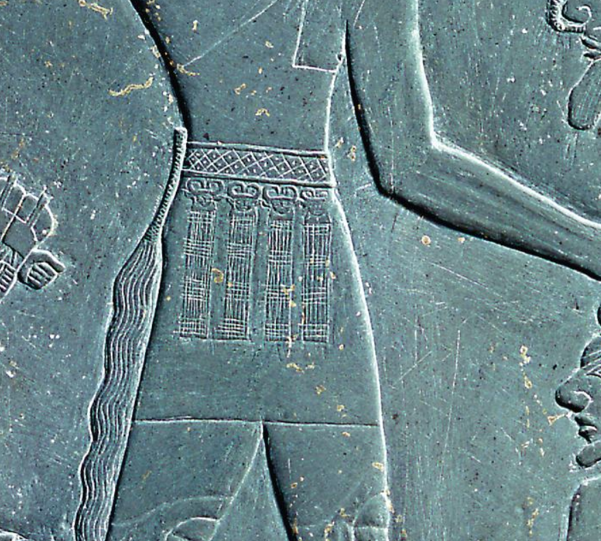 나르메르가 착용한 벨트에는 네 개의 구슬 술이 달려 있는데, 각각 하토르 여신의 머리 모양 장식으로 장식되어 있다. 이들은 팔레트 양쪽 상단을 장식하는 것과 같은 머리 모양이다. 벨트 뒤쪽에는 사자의 꼬리를 나타내는 긴 프린지가 달려 있다.