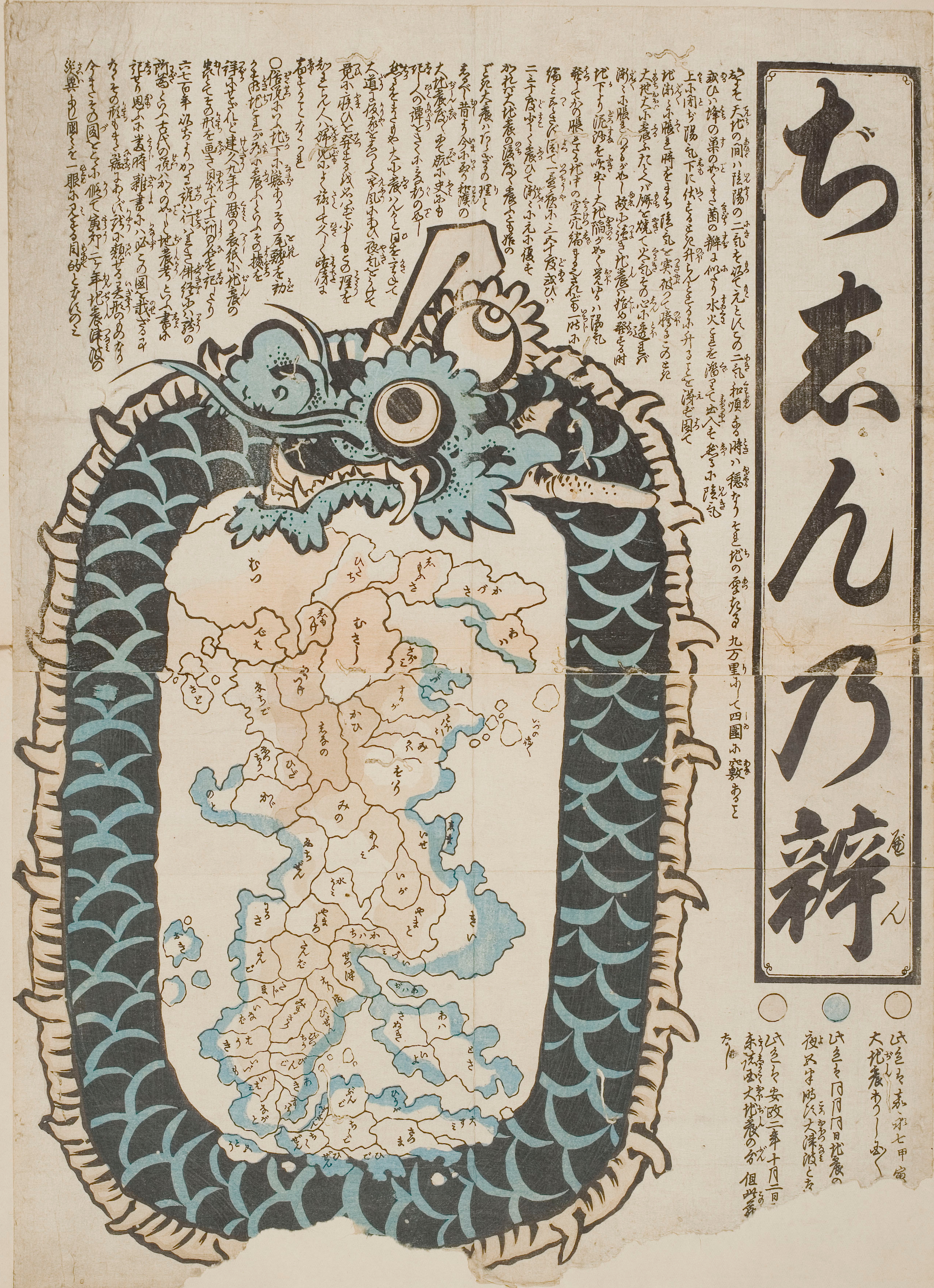 에도 시대 초기까지는 지진을 일으키는 존재가 큰 뱀(용)이라고 생각했다. "대지를 동물이 지탱하고 있으며, 이것이 움직이면 지진이 일어난다"는 지진 신화는 세계 각지에서 발견되지만, 이 동물을 뱀으로 하는 신화는 동아시아 각지에서 보이는 보편적인 것이다간에이 원년(1624년)에 제작된 『대일본국 지진의 그림』에서는, 일본 열도를 용사가 둘러싸고, 그 머리와 꼬리가 겹쳐진 히타치국요석이 그려져 있다。 아사이 료이가 간분 2년(1662년)에 발생한 간분 오미·와카사 지진의 전말을 기록한 『요석』에서도 "용왕이 화낼 때 대지가 흔들린다"라고 기록되어 있다