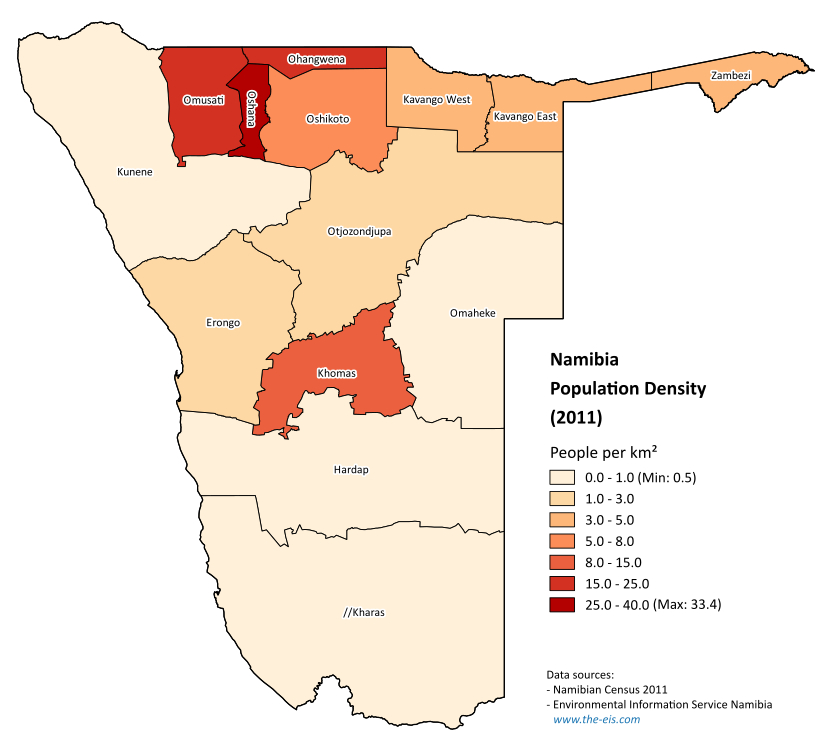 Map Namibia - Popultion density by administrative division