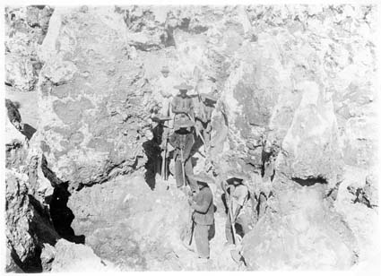 석회암 봉우리 사이에 서 있는 나우루의 중국인 인광석 노동자