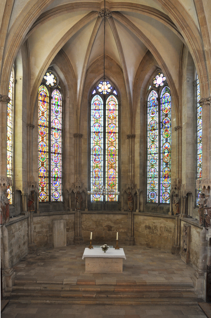 초기 고딕 건축 양식의 서쪽 성가대석은 홀 성가대석이며, 높은 갤러리로 지어졌다. 갤러리 수준에서, 볼트를 지지하는 열 개의 기둥은 건축주의 실물 크기 조각상과 융합된다. 나움부르크 대성당의 열두 개의 건축주 조각상은 유럽 중세 조각의 가장 뛰어난 창작물 중 하나로 손꼽힌다.[15]