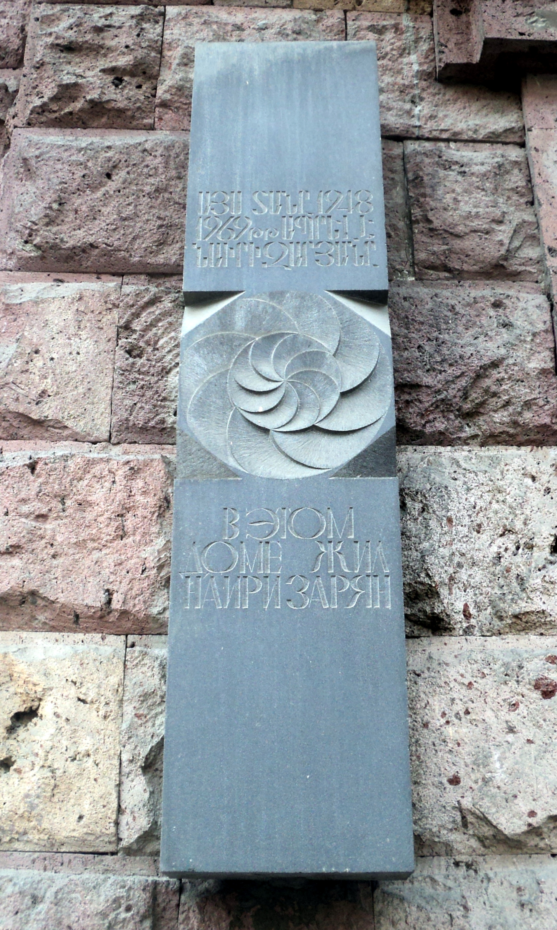 나이리 자랸은 아르메니아 대량 학살의 생존자이자 아르메니아의 작가이다. 1915년 동 아르메니아로 피신했으며, 1918년에는 오스만 군대에 맞서 민병대로 싸웠다. 예레반 국립 대학교와 레닌그라드 국립 예술원에서 수학했으며, 시 "루샨의 바위"와 소설 "하차반"을 발표했다. 제2차 세계 대전 중 시와 메모를 발표했으며, 1946년에는 희곡 ''아라 게게치크''를 출판했다. 1951년부터 1958년까지 아르메니아 소비에트 사회주의 공화국 최고 소비에트의 대의원을 역임했다.