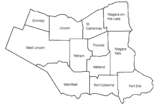 나이아가라 지역은 다음과 같은 도시, 소도시, 타운십으로 구성되어 있다.