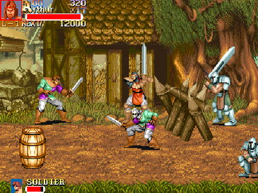 아서 | 국왕이자 주인공으로, 엑스칼리버 검을 사용한다.[19] 속도와 힘의 균형이 잘 잡혀있다.[19] 공격 버튼을 누른 다음 조이스틱을 적 방향으로 유지하면 강력한 베기 공격을 할 수 있다. 처음에는 사슬 갑옷과 가죽 갑옷을 착용하지만, 레벨이 올라갈수록 더 많은 몸 갑옷(은색, 금색)을 얻고 엑스칼리버도 강해진다. 말에 탔을 때 가장 강력하다. |