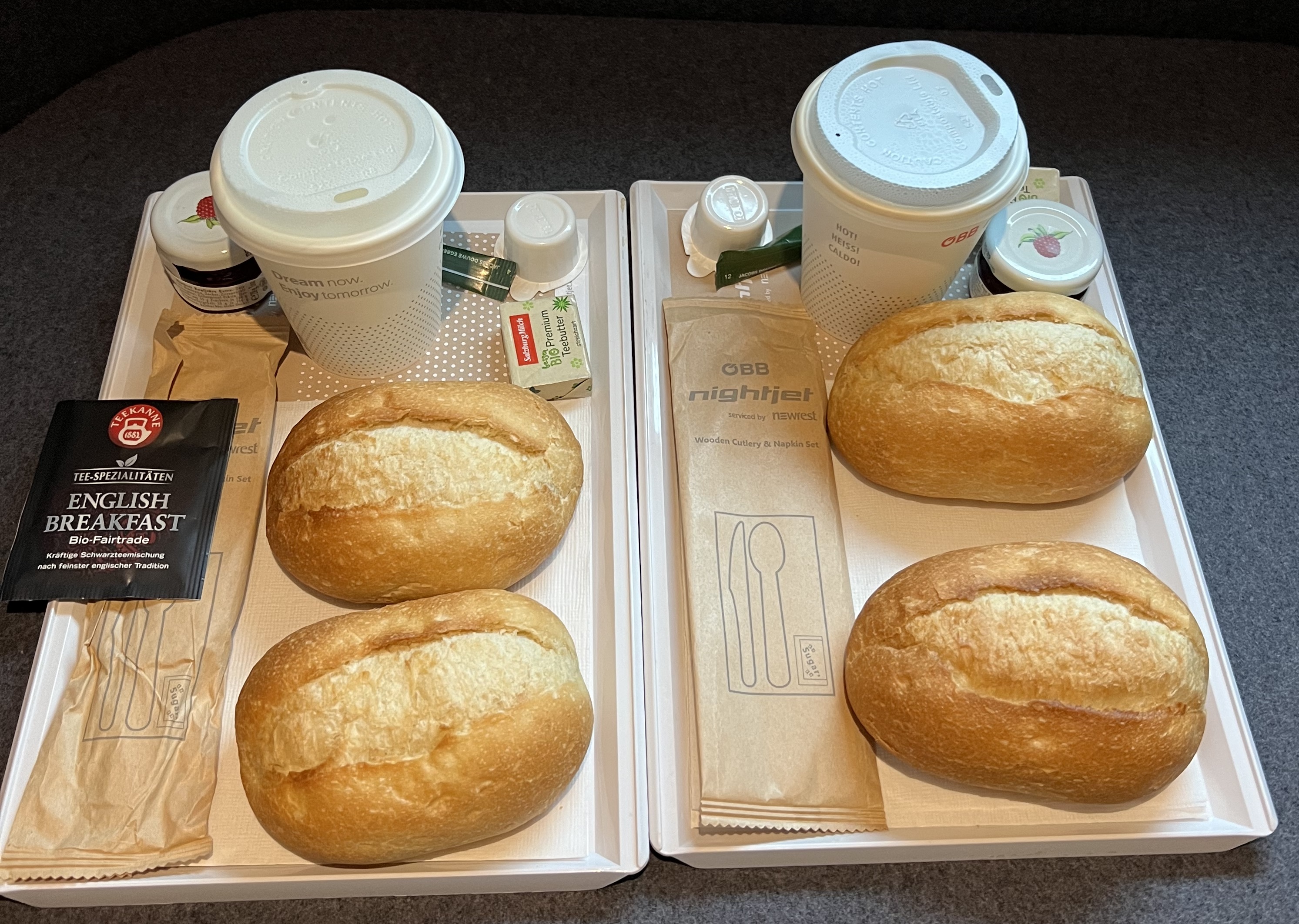침대차와 쿠셋에서는 아침 식사가 제공되는데, 침대차에서는 빵, 요구르트, 살라미, 버터, 음료 등 6가지 메뉴를 선택할 수 있고, 쿠셋에서는 빵과 음료가 제공된다. 아침 식사는 하차역 도착 약 40분 전에 제공된다.