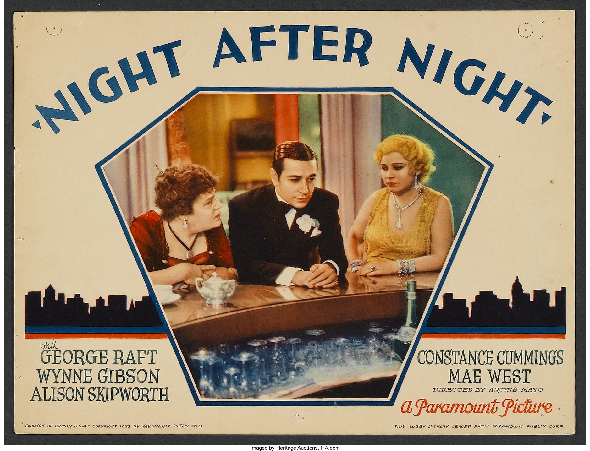 《나이트 애프터 나이트》는 전직 권투 선수 조 앤턴이 밀주 판매점을 운영하며 사교계 여성 제리 힐리와 사랑에 빠지는 이야기를 그린 영화이다. 조는 제리를 짝사랑하지만, 그녀가 돈 때문에 다른 남자와 약혼한 사실을 알고 실망한다. 이 영화는 1929년 월스트리트 대폭락 이후의 사회상을 배경으로, 속물근성과 진정한 사랑의 의미를 탐구한다. 조지 래프트, 콘스턴스 커밍스, 메이 웨스트 등이 출연했으며, 메이 웨스트의 캐스팅과 조지 래프트의 첫 주연작으로도 알려져 있다.