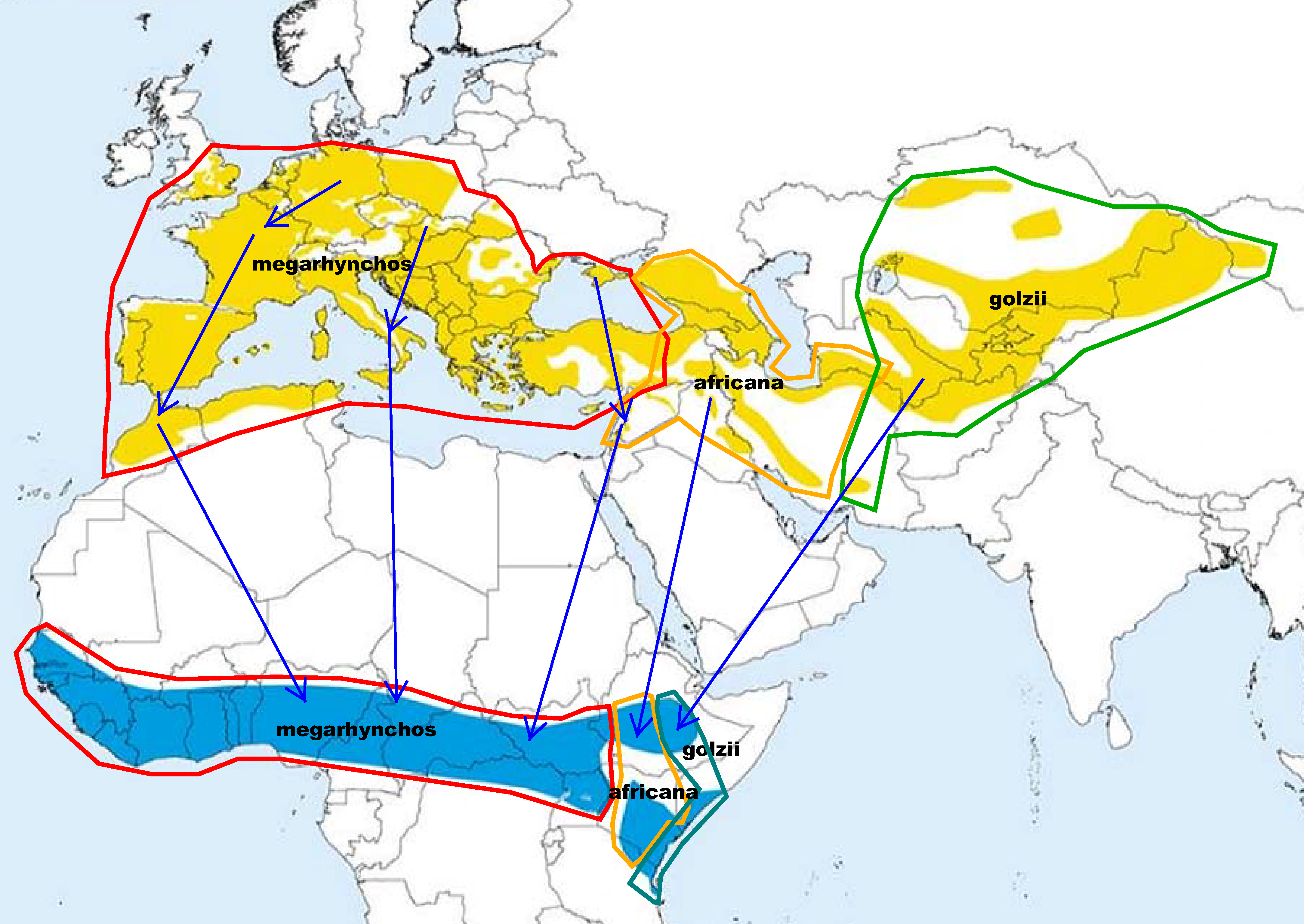 - '''코카서스 나이팅게일''' (''L. m. africana'') - 코카서스 및 터키 동부에서 이란 남서부 및 이라크까지, 동아프리카에서 겨울을 난다.