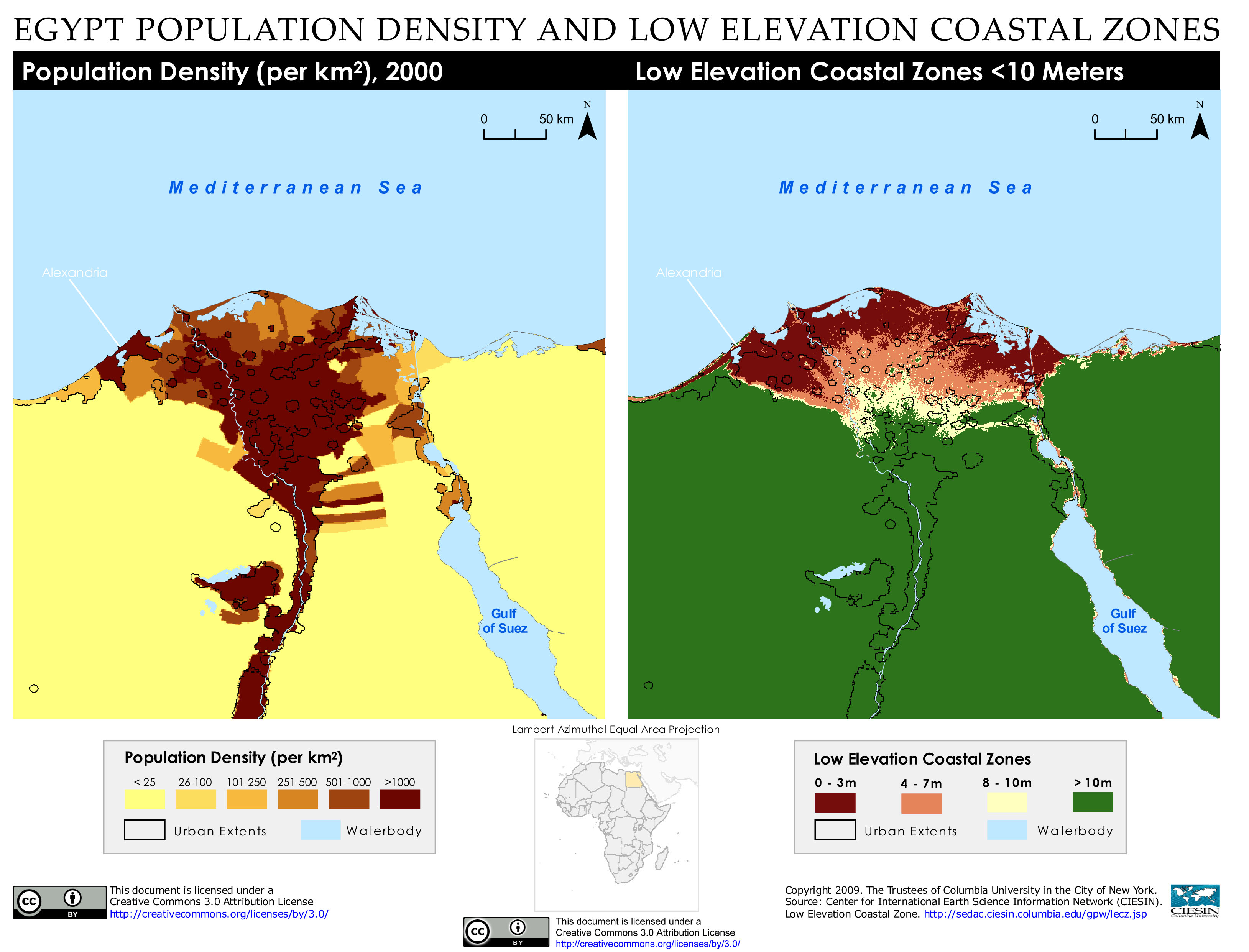 만약 극지방의 빙상이 녹는다면, 고대 항구 도시인 알렉산드리아를 포함한 삼각주의 북쪽 상당 부분이 지중해 아래로 사라질 수 있다. 의 해수면 상승은 나일강 삼각주 지역 전체 토지 면적의 약 6.6%에 영향을 미칠 수 있다. 해수면이 상승하면 약 88만 7천 명의 사람들이 침수 및 이주 위험에 처할 수 있으며, 약 의 초지, 의 습지, 의 경작지, 의 도시 지역이 파괴될 수 있으며,[22] 약 가 침수될 수 있다.[23]