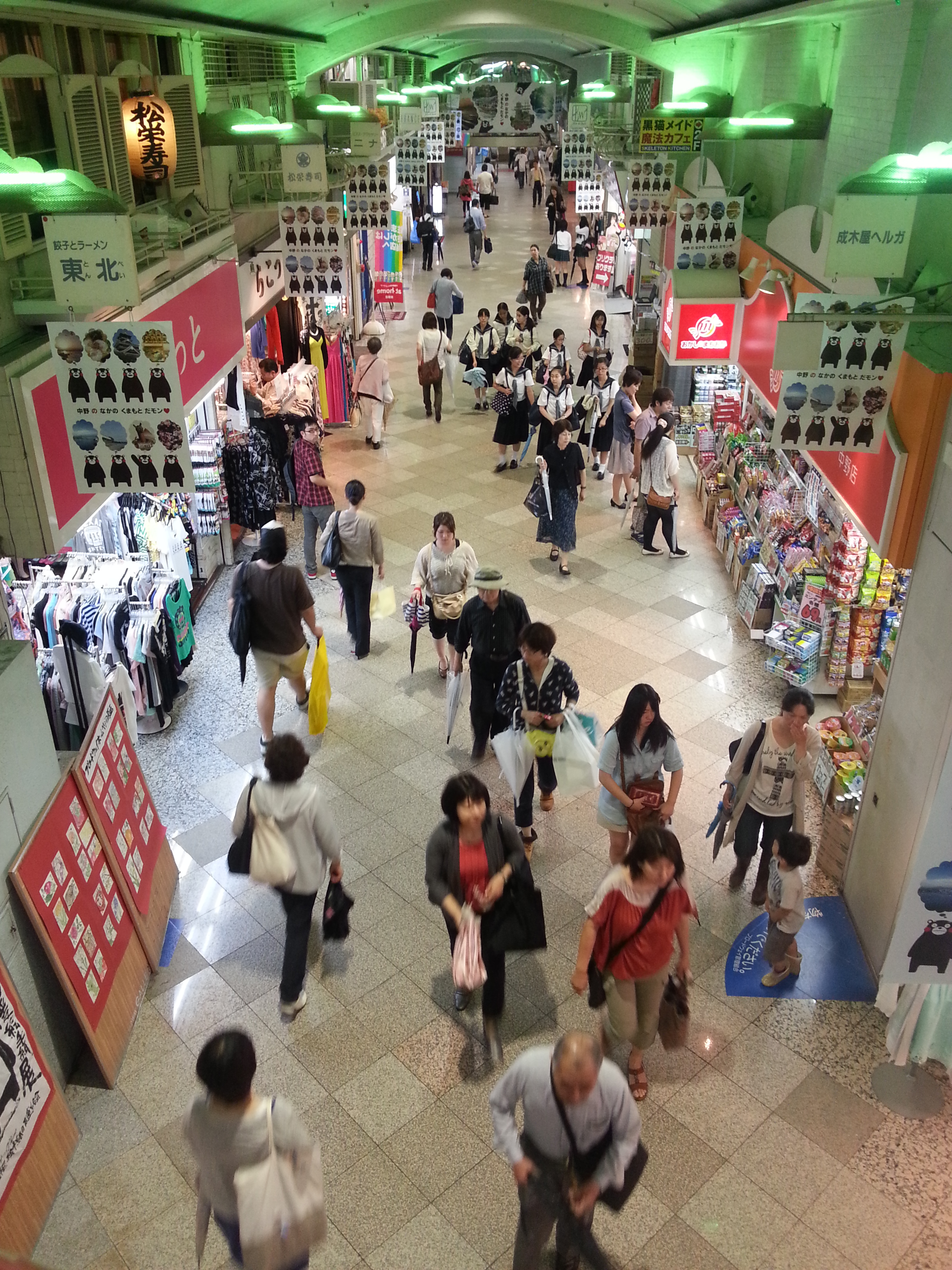 - 지상 1층: 생활용품을 판매하는 가게들이 많다. 가방, 의류 (신사복, 숙녀복), 신발, 모자, 스포츠 용품, 컴퓨터, 약국, 사진관, 찻집, 귀금속점, 게임 센터 (아도어즈) 등이 있다. 또한, 카드 숍이나 렌탈 쇼케이스 숍 등 2층 이상에 주로 있는 매장들도 일부 입점해 있다.