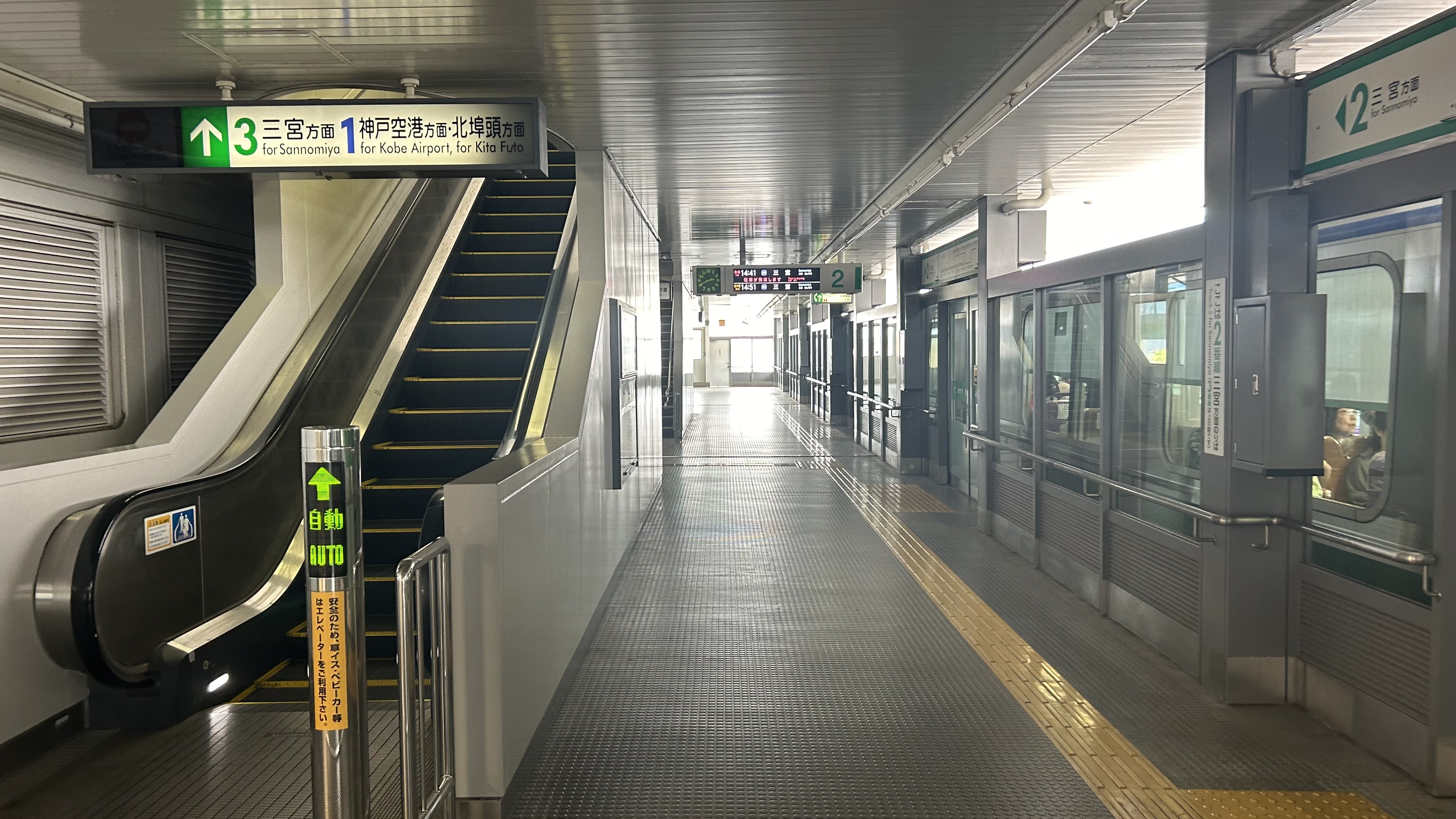 2005년 9월 10일・11일에는 고베 공항 방면 연장 공사로 궤도 전환 공사가 한 번 더 진행되어 전 노선 종일 영업이 정지되었다. 2006년 2월 2일에는 고베 공항역까지 노선이 연장 개통되고 쾌속 운전이 개시되어 쾌속 통과역이 되었다.