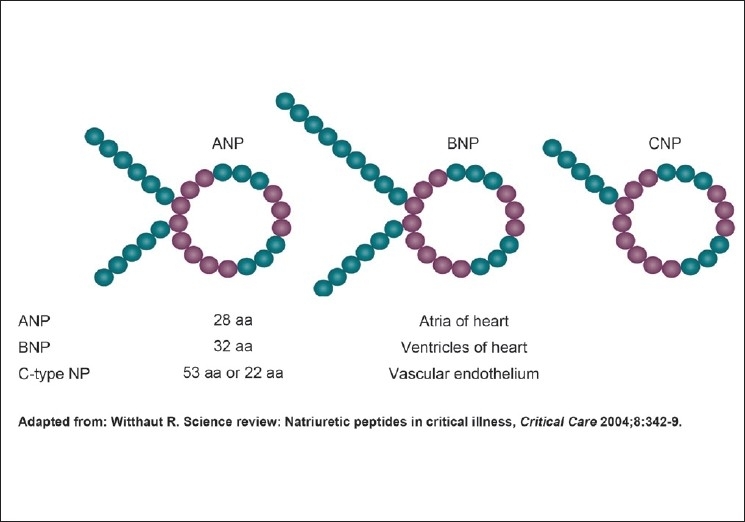 - B형 나트륨이뇨 펩타이드(BNP): 처음에는 돼지의 뇌에서 발견되었지만, 주로 심장에서 생성된다. ANP와 유사한 기능을 수행한다.