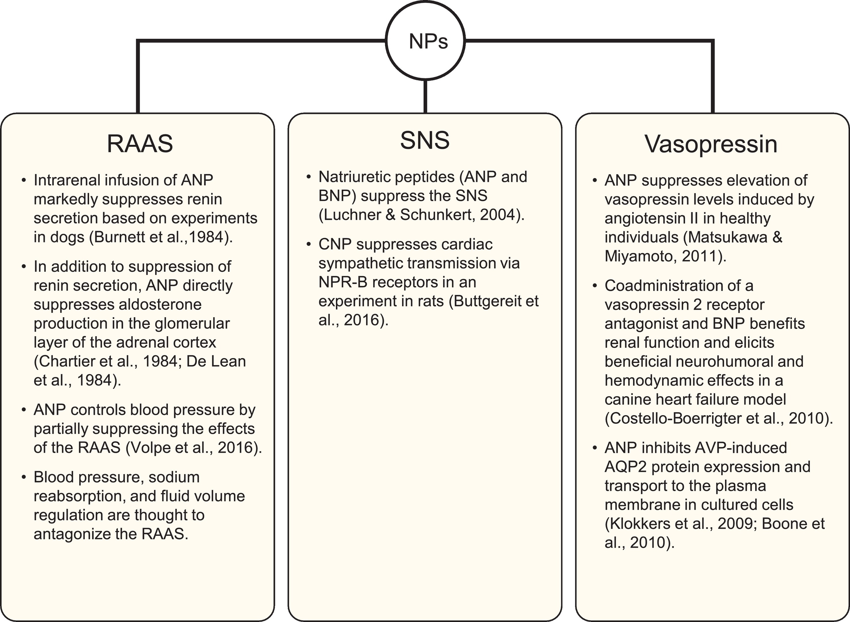 나트륨이뇨펩타이드는 혈압을 조절하는 레닌-안지오텐신-알도스테론 시스템(RAAS)의 활동을 차단할 수 있다. 연구에 따르면 ANP는 레닌 분비와 알도스테론 생산을 억제할 수 있다. 또한, 나트륨이뇨펩타이드는 신체의 "투쟁 도피" 반응을 제어하는 교감 신경계(SNS)를 억제한다.[2] 나트륨이뇨펩타이드와 체액 균형을 조절하는 호르몬인 바소프레신 간의 관계는 ANP가 바소프레신 신호를 억제할 수 있음을 보여주는 연구를 통해 밝혀졌다. 연구자들은 이 관계에 대한 더 나은 이해를 위해 노력하고 있다. 동물 연구는 바소프레신 수용체 길항제를 BNP와 함께 사용하여 심장 기능과 혈류를 개선할 가능성을 보여준다.[2]