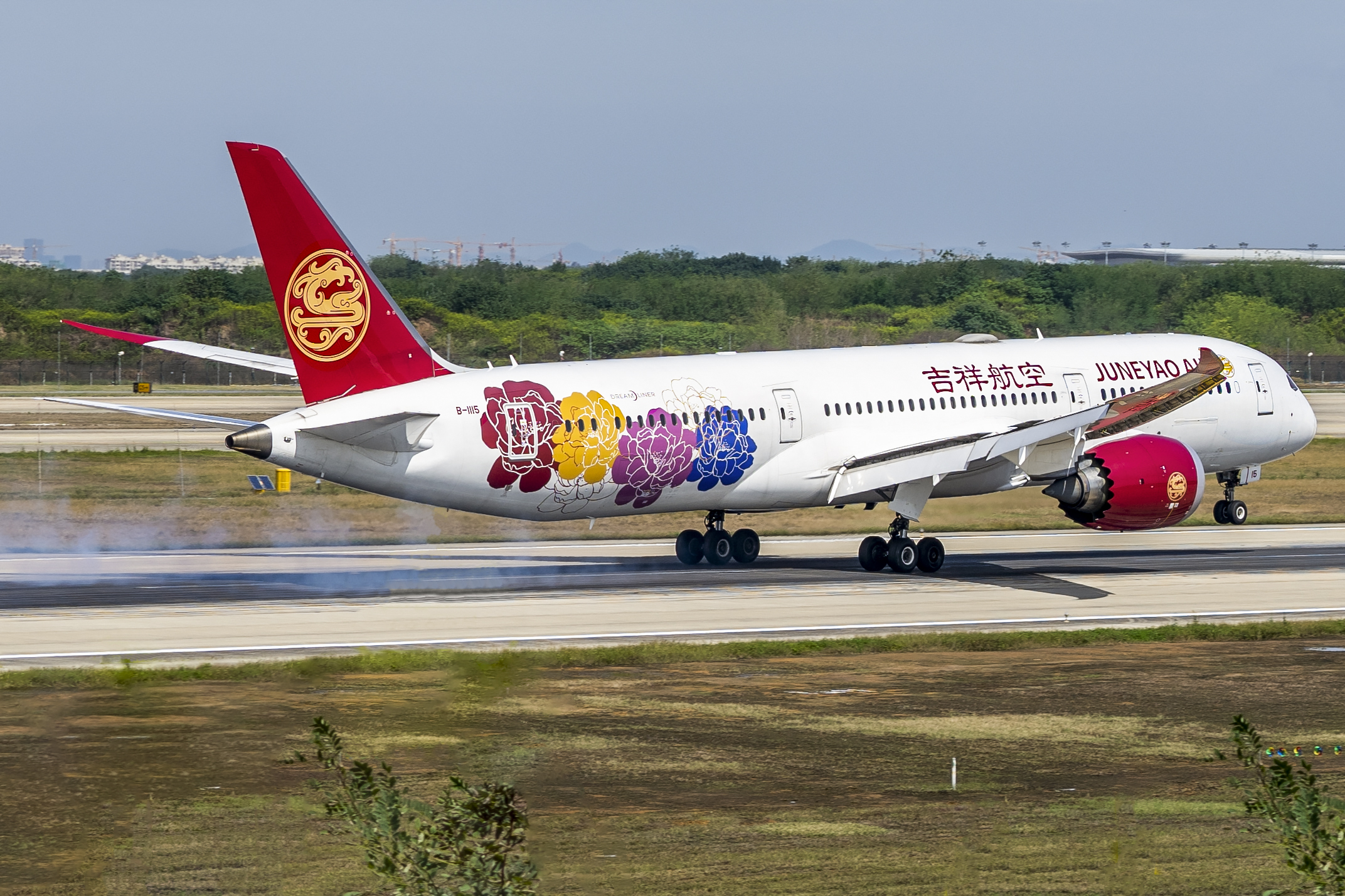 준야오 항공 보잉 787 드림라이너 -9 드림라이너가 "중국 모란(몽려생화)" 특별 도색을 하고 오사카에서 난징 노선을 운항하며 난징 루커우 국제공항 07 활주로에 착륙하고 있다