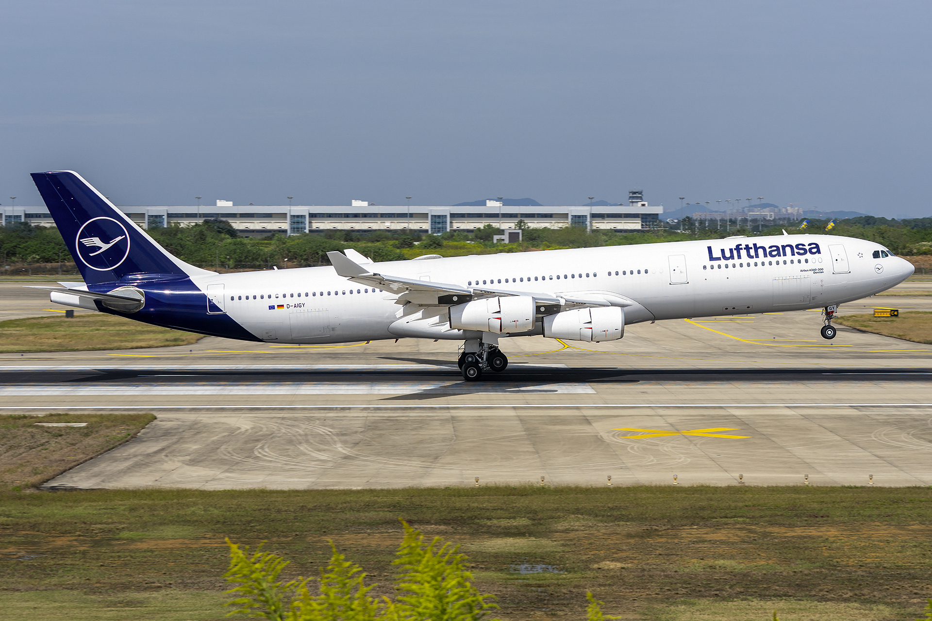 루프트한자 에어버스 A340-313 기종이 난징 루커우 국제공항 07 활주로에 착륙하고 있다