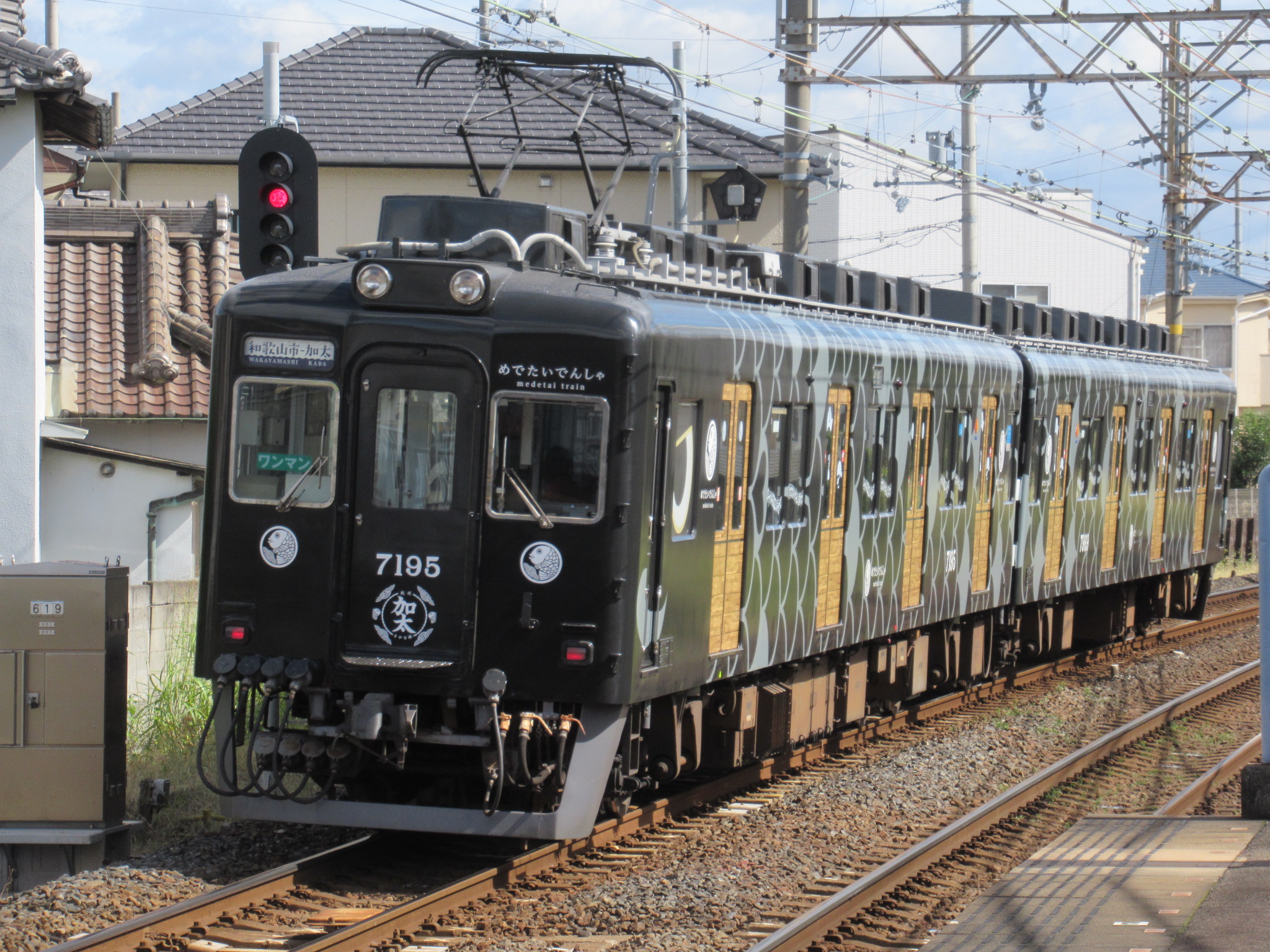 2016년부터는 "가다 사카나선 프로젝트"의 일환으로, 7100계 전철을 개조한 관광 열차 "메데타이 덴샤"가 운행되고 있다.[19] 2016년에 분홍색, 2017년에는 하늘색의 "메데타이 덴샤"가 등장하여[21], 2018년 4월에 분홍색이 "사치", 하늘색이 "카이"로 각각 명명되었다.[22] 2018년 11월 23일에는 가다역에서 "사치"와 "카이"의 결혼식이 거행되었으며[23], 2019년 1월 15일에는 "신혼여행"으로 "사치"와 "카이"를 연결한 4량 편성으로 난카이 본선 와카야마시역 - 난바역 간에 임시 열차가 운행되었다.[7] 2019년 3월 31일에는 "사치"와 "카이"의 아이(딸)로서 빨간색의 "메데타이 덴샤"가 등장했다.[24][8] 이 편성에는 같은 해 7월 25일에 "나나"라는 애칭이 주어졌으며, 3개 편성의 "메데타이 덴샤"의 애칭의 머리글자를 이으면 "사카나"가 되며[9], "사치"와 "카이"의 애칭을 이으면 "해산물"이 된다. 2021년 9월 18일부터는 4번째 편성으로 "사치"의 오빠라는 설정의 검은색 "카시라" 편성이 운행을 시작했으며[10], 2024년 7월 13일부터는 5번째 편성으로 2000계 전철을 개조한, 지금까지의 4개 편성의 조상이라는 설정의 "카나타"가 운행을 시작했다.[11]