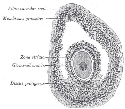 과립 세포 또는 난포 세포는 난포 내의 난자를 둘러싸는 세포이며, 순환하는 생식선 자극 호르몬 수치가 높아짐에 따라 수가 증가하거나 테스토스테론에 반응하여 감소한다. 또한 난소 호르몬 합성을 조절하는 펩타이드를 생성한다. 난포 자극 호르몬(FSH)은 과립 세포가 표면에 황체 형성 호르몬(LH) 수용체를 발현하도록 유도하며, 순환하는 LH가 이러한 수용체에 결합하면 증식이 멈춘다.[7]배우자, 즉 생식 세포는 감수 분열을 통해 생식샘 내에서 형성된다. 난자 형성을 위한 감수 분열은 태아기의 난소에서 시작된다. 난자는 제1 감수 분열 전기에서 일단 정지하고, 한 층의 난포 상피 세포(과립층 세포)와 함께 원시 난포를 형성한다. 출생 후 난포의 발육은 각종 성장 인자, 난포 자극 호르몬(FSH), 및 황체 형성 호르몬(LH)에 의해 조절된다. FSH는 또한 LH와 함께 난포 상피 세포(과립층 세포)에서 에스트로겐 분비를 촉진한다. 제1 성숙 감수 분열 전기에서 정지한 일차 난모세포는 배란의 트리거가 되는 LH 서지에 의해 감수 분열을 재개한다. 극체라고 불리는 세포와 이차 난모세포로 분열된 후, 다시 제2 감수 분열 중기에서 정지한다. LH 서지에 의해 배란된 이차 난모세포는 난관에서 정자와 수정함으로써 감수 분열을 완료하고, 극체를 다시 방출한 후에 수정이 완료된다. 극체는 난자로서 기능하지 않고 퇴행한다. 따라서 그라프 난포라고 불리는 성숙한 난포 안에 실제로 있는 것은 일차 난모세포이다.