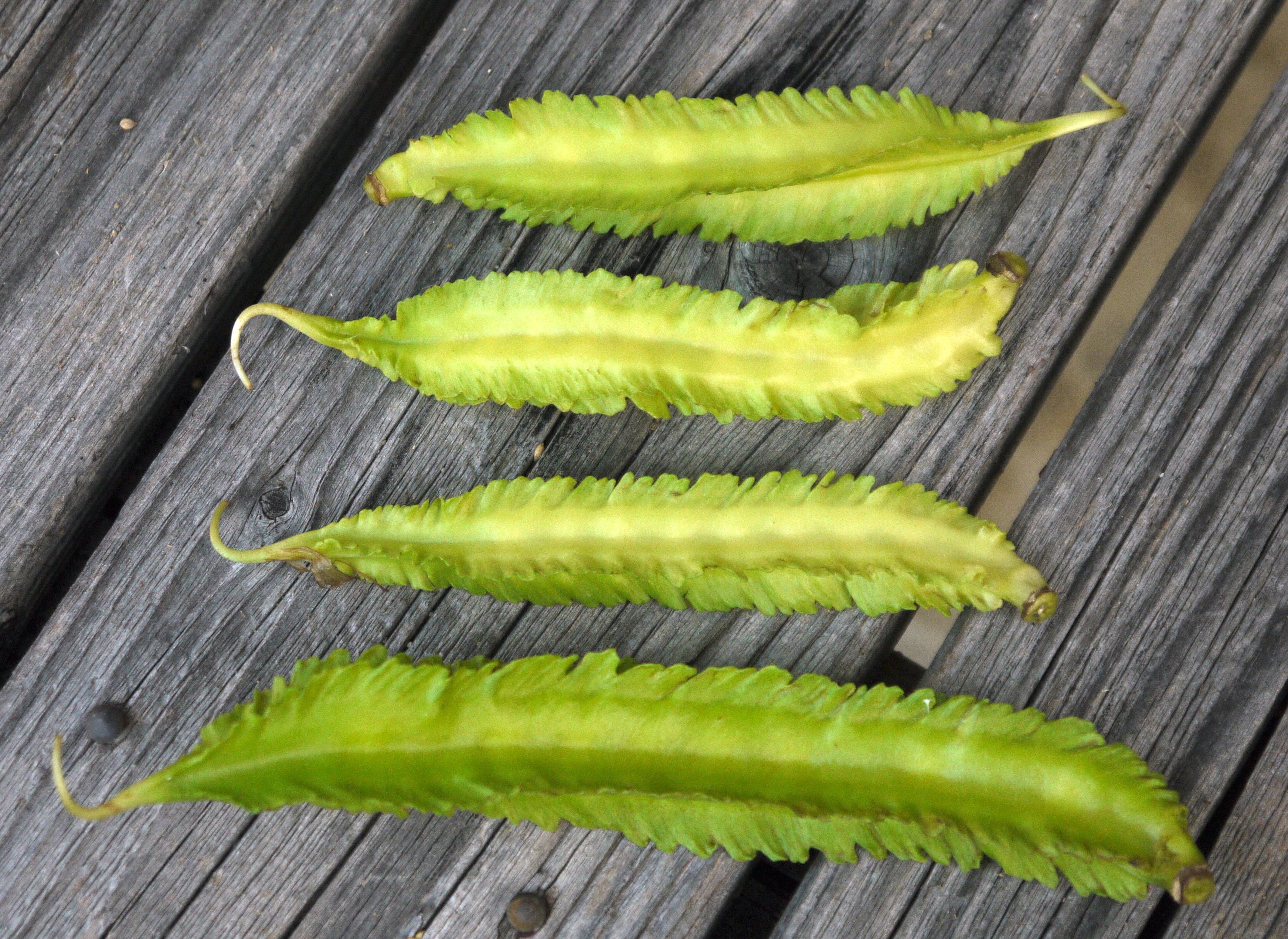 콩 꼬투리는 유전자형에 따라 매끄럽거나 거칠 수 있다. 일반적으로 단면이 직사각형이며(때로는 납작하게 보이기도 함), 길이는 15cm에서 22cm이고, 가장자리가 물결 모양인 4개의 날개가 길이 방향으로 뻗어 있다.[2] 껍질은 왁스질이고 어린 꼬투리에서는 속살이 부분적으로 반투명하다. 꼬투리의 색깔은 크림색, 녹색, 분홍색 또는 보라색일 수 있다. 완전히 익으면 꼬투리는 잿빛 갈색으로 변하고 갈라져 씨앗(콩)을 방출한다. 씨앗은 종종 둥근 모양이며, 타원형과 직사각형 씨앗도 나타난다. 씨앗은 재배 및 보관 조건에 따라 흰색, 크림색, 짙은 황갈색 또는 갈색으로 나타날 수 있다.[1] 콩 자체는 용도와 영양 성분(단백질 29.8%~39%)에서 대두와 유사하다.
