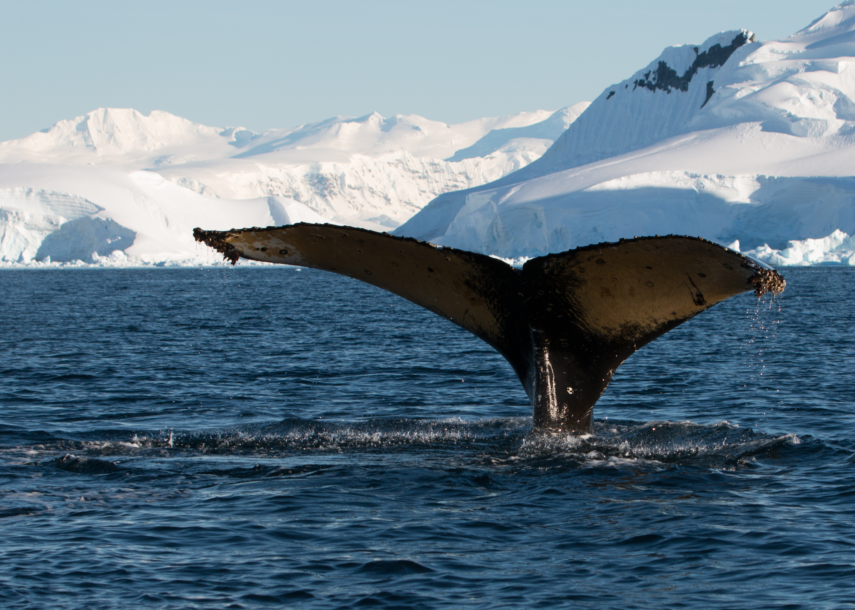 대규모로 무리를 짓는 남극크릴은 남극해 생태계의 핵심종으로,[240] 고래, 물개, 표범물범, 오징어, 얼음물고기, 펭귄, 알바트로스와 같은 많은 조류의 중요한 먹이 생물이다.[240] 일부 해양 동물 종은 직접적 또는 간접적으로 식물 플랑크톤에 의존하여 생존한다. 남극 해양 생물에는 펭귄, 흰긴수염고래, 범고래, 대왕오징어, 물개가 포함된다.[64] 남극털갈매기는 18세기와 19세기에 미국과 영국의 물개잡이들에 의해 그 모피 때문에 대량으로 사냥되었다.[61] 표범물범은 남극 생태계의 최상위 포식자이며 먹이를 찾아 남극해를 이동한다.[62]