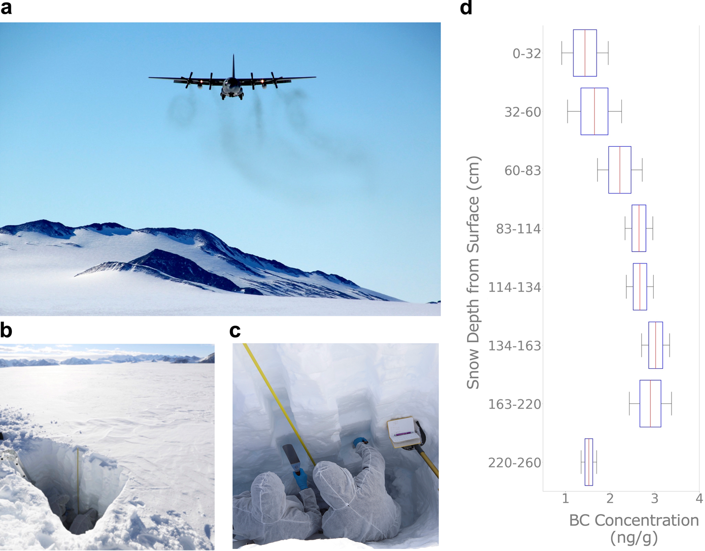 유니온 빙하(왼쪽 상단)에 착륙하는 민간 Il-76 항공기 (검은 탄소 농도가 주변 눈에서 증가하는 것을 샘플 수집(왼쪽 하단)을 통해 관찰(오른쪽))