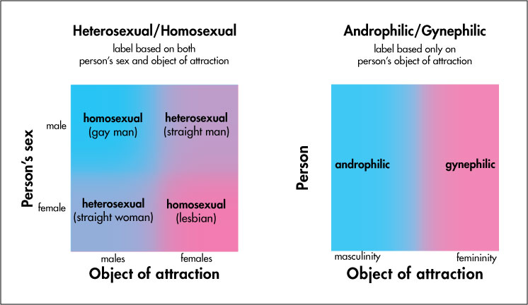 남성애(Androphilia)와 여성애(Gynephilia)는 개인의 성 정체성이나 복장에 관계없이 선호하는 파트너의 유형을 나타내기 위해 1980년대 심리학자 론 랭그빈이 제안하고 대중화한 용어이다.[35][36]