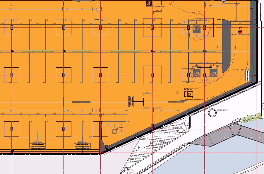주차장 뒷면은 구타흐 강 흐름에 맞춰 각이 져 있어 각 층에 하나씩 있는 두 개의 주차 공간은 독특한 모양을 하고 있으며, 복잡한 주차 조작을 통해서만 접근할 수 있다. 슈트뢰벨 시장과 건축가 주디스 하스, 마티아스 후이스만스는 200만유로를 들여 건설된 220개 주차 공간에서 이 두 공간을 제외할지 논의했다.[5][6]