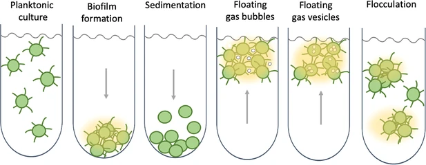 각 개별 세포 (각 단일 남세균)는 일반적으로 두껍고 젤라틴질 세포벽을 가지고 있다.[52] 편모가 없지만, 일부 종의 호르모고니아는 표면을 따라 활주하여 이동할 수 있다.[53] 물 기둥에서 일부 남세균은 기포를 형성하여 부유하며, 이는 고세균에서도 볼 수 있다.[54] 이러한 소포는 세포 소기관이 아니며, 지질 막이 아닌 단백질 외피로 둘러싸여 있다.