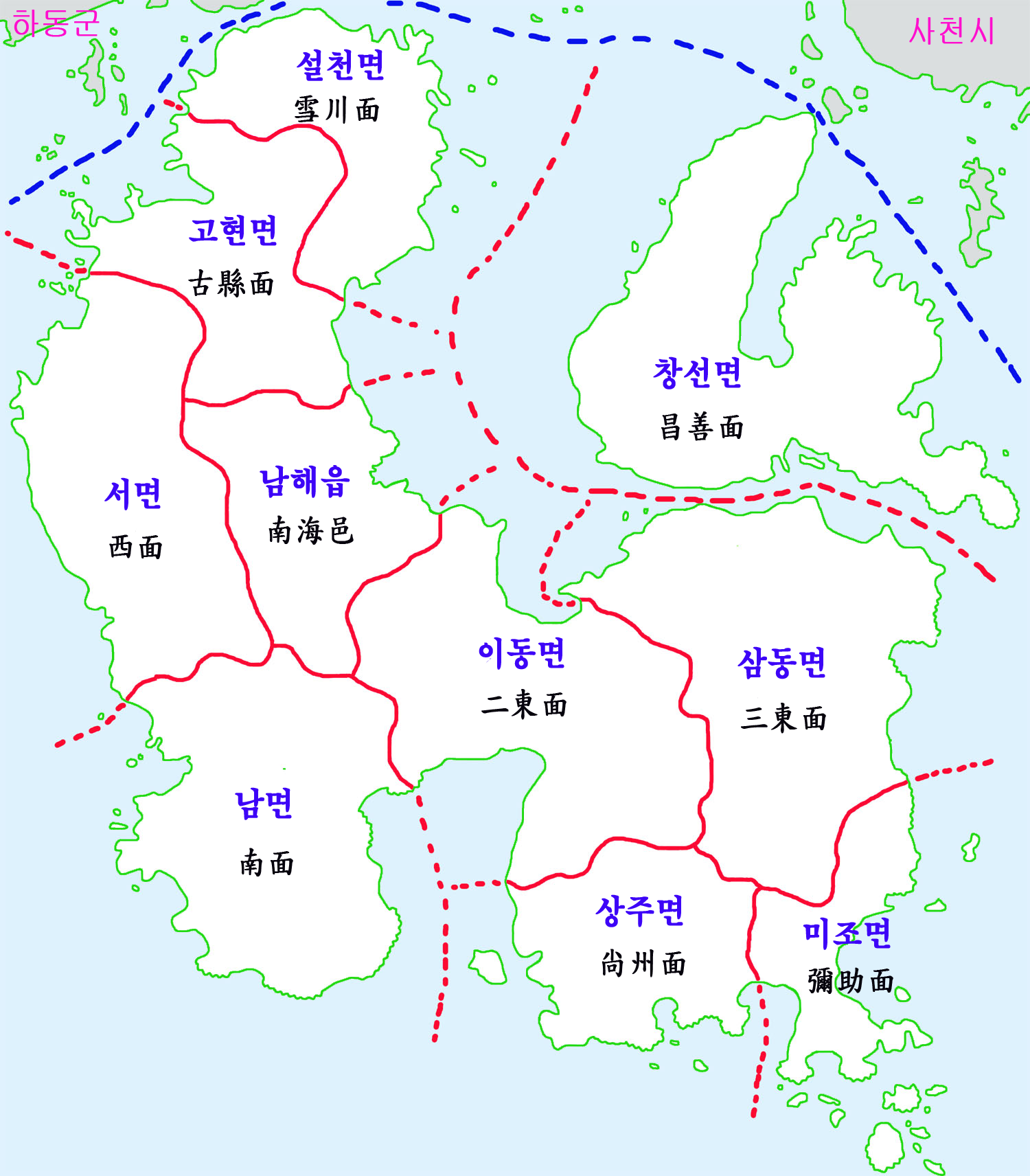 남면 (南面 (南海郡)) | 당항리, 상가리, 덕월리, 석교리, 엄포리, 평산리, 홍현리, 죽전리, 선구리 |