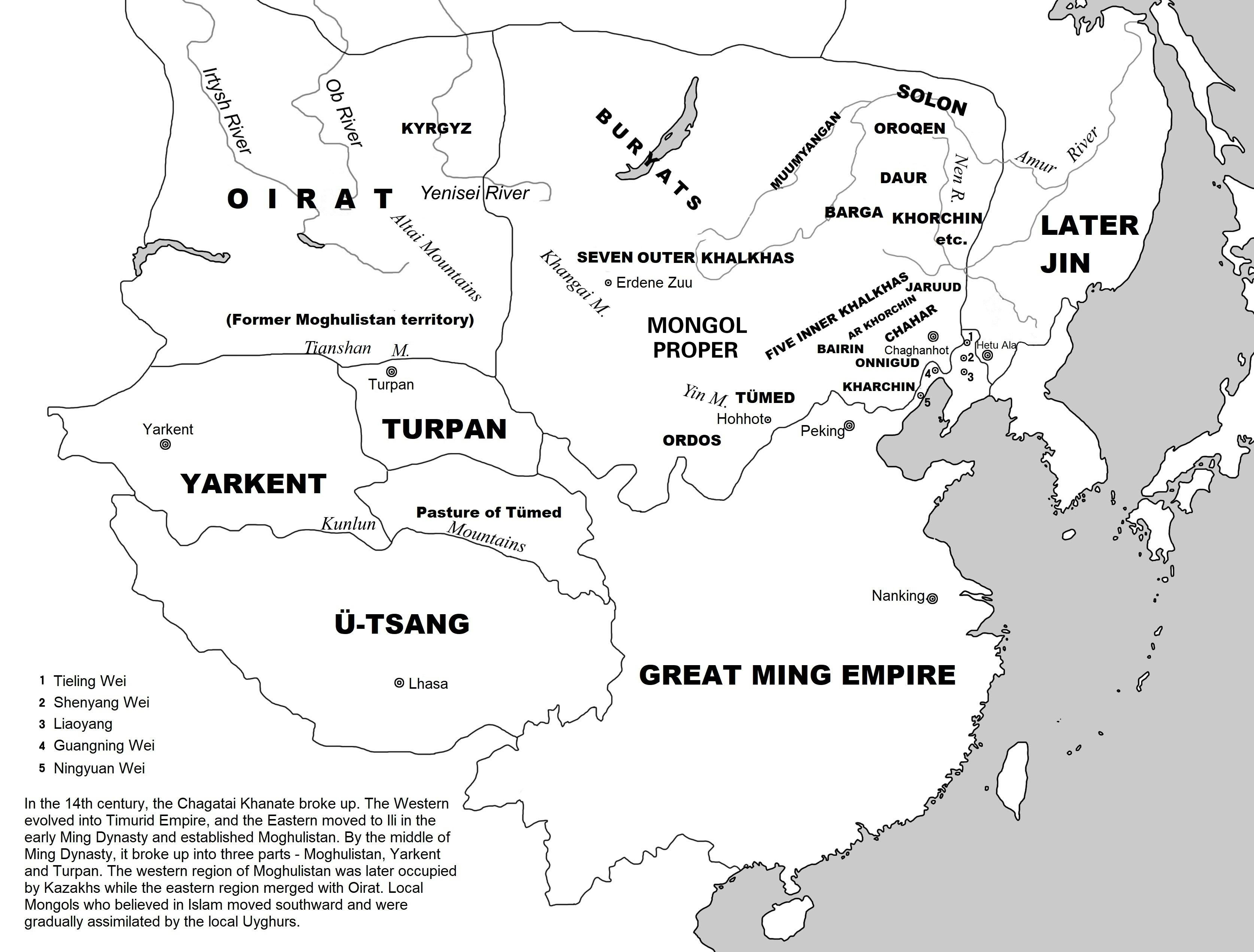 원이 북쪽으로 물러난 후 몽골인들은 서부의 오이라트, 북부의 할하, 그리고 내몽골의 세력으로 나뉘어 서로 경쟁하였다. 1449년 토목의 변에서 오이라트의 지도자 에센 타이시가 명나라 황제를 사로잡은 이후, 몽골인들이 외몽골에서 내몽골 지역으로 남하하기 시작했다. 이로 인해 1635년까지 내몽골은 북원 시대 몽골의 정치적, 문화적 중심지가 되었다.[11]