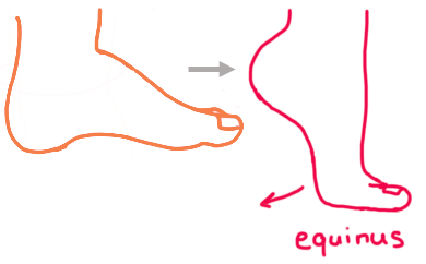 | 4 | ![]() | 첨족: 발이 아래로 향해 발가락으로 걷게 된다. 아킬레스건이 뻣뻣하여 발을 아래로 당긴다. |