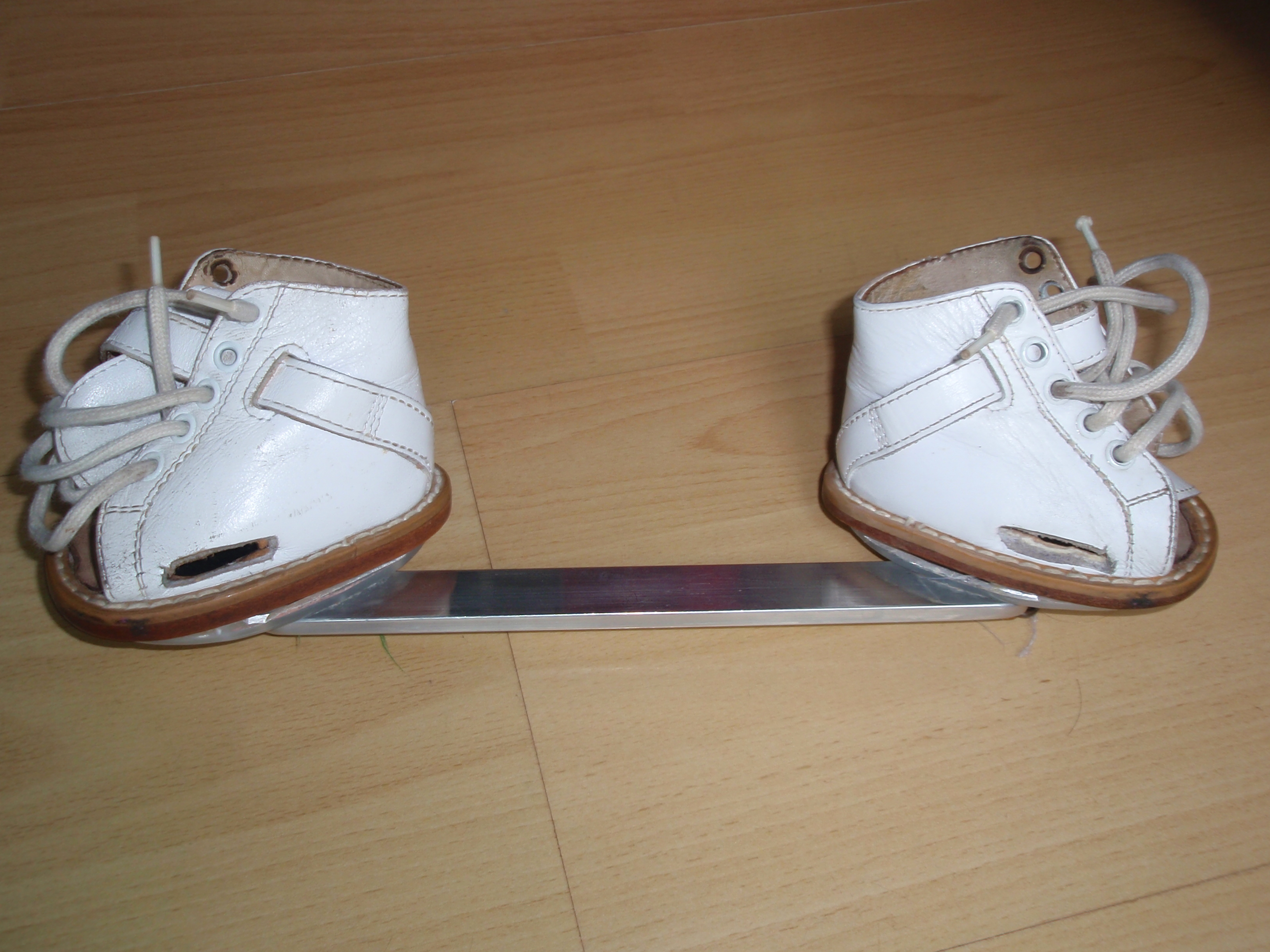 - '''보조기 착용''' : 깁스와 아킬레스건 절개술로 교정 후, 재발 방지를 위해 보조기를 착용한다. 발 벌림 보조기(FAB) 또는 부츠 앤 바(BnB)라고도 불리는 이 보조기는 두 개의 신발(또는 부츠)이 막대로 연결된 형태이다. 처음에는 24시간 착용하고, 3개월 후부터 착용 시간을 점차 줄여 1세 전후에는 하루 12~14시간 착용한다. 이후 최소 4~5세, 또는 그 이상(6~9세)까지 주로 밤에 착용한다.[35]
