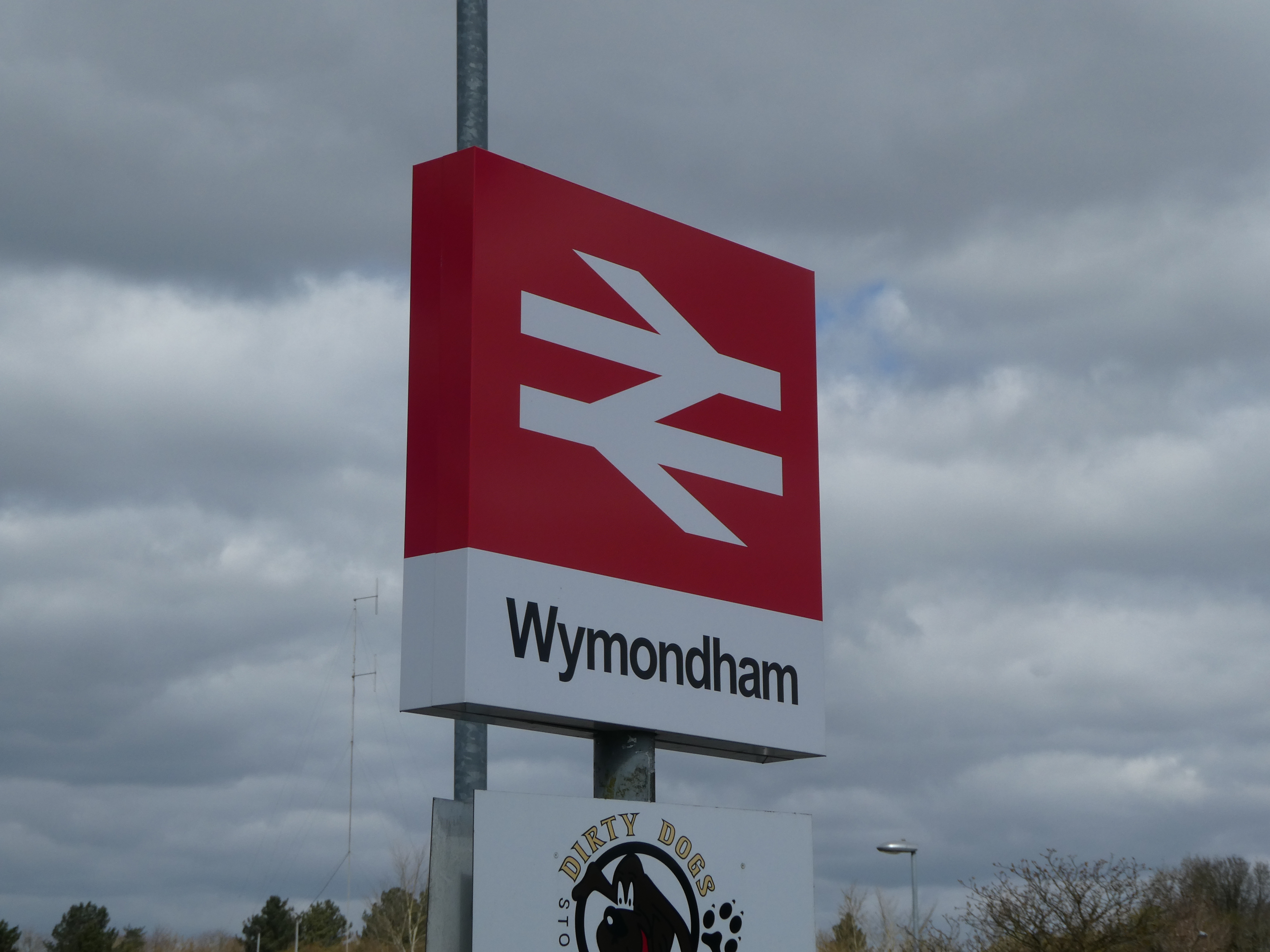 윔엄 철도역의 기차역 표지판. 이중 화살표 로고가 보인다.